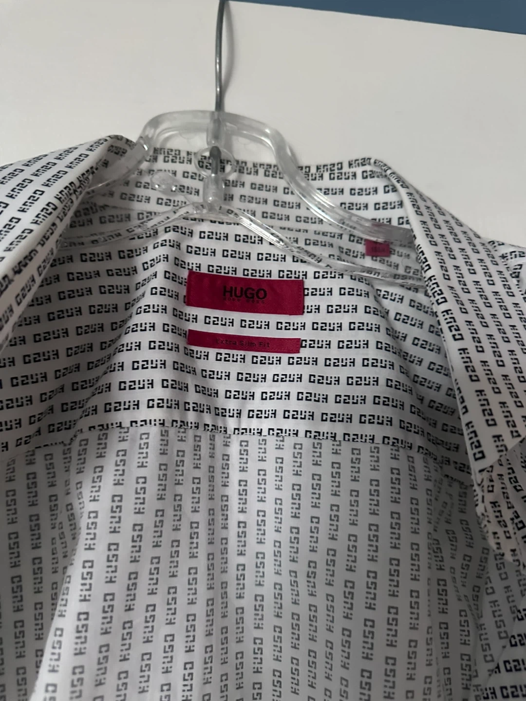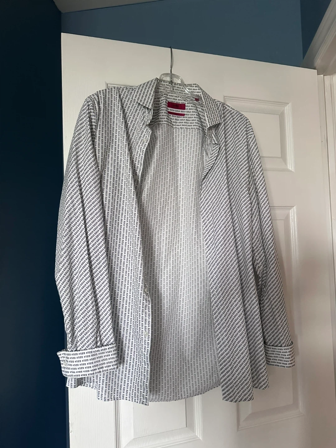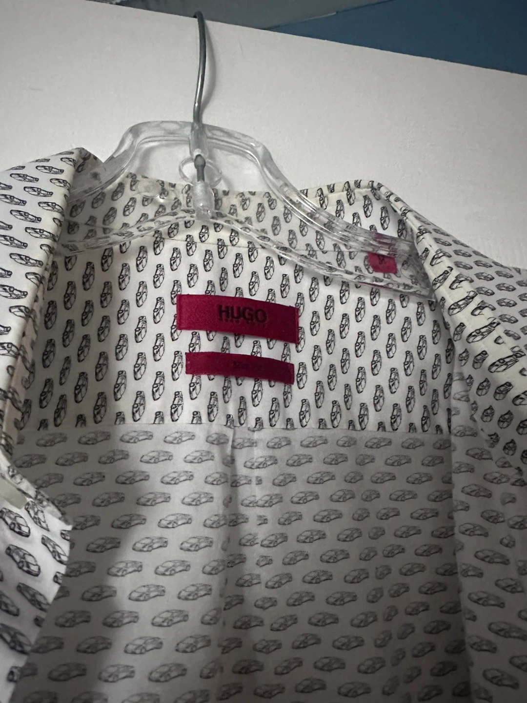 10Here's a Hugo Boss button-down shirt with a unique pattern! It's in great condition and ready for a new home. The shirt features a stylish design with the Hugo logo incorporated throughout the pattern. Perfect for adding a touch of sophistication to your wardrobe