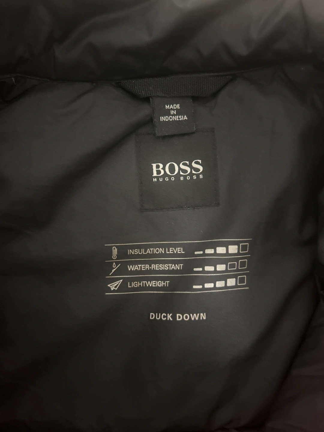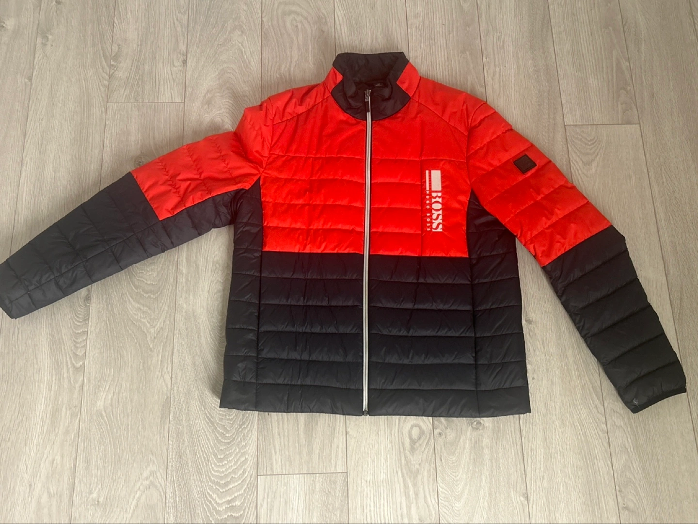 87Men's lightweight jacket. Red and black colour block design. Duck down filling. Water-resistant. Made in Indonesia. Minor damage on the cuff.