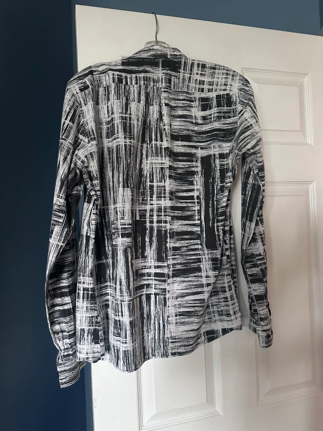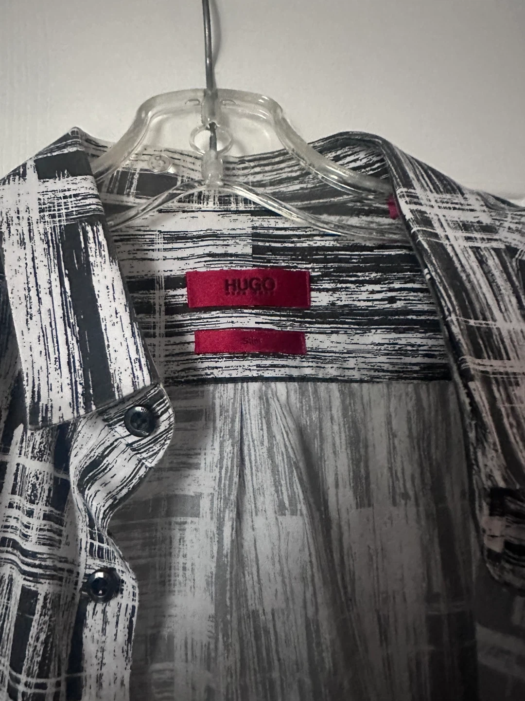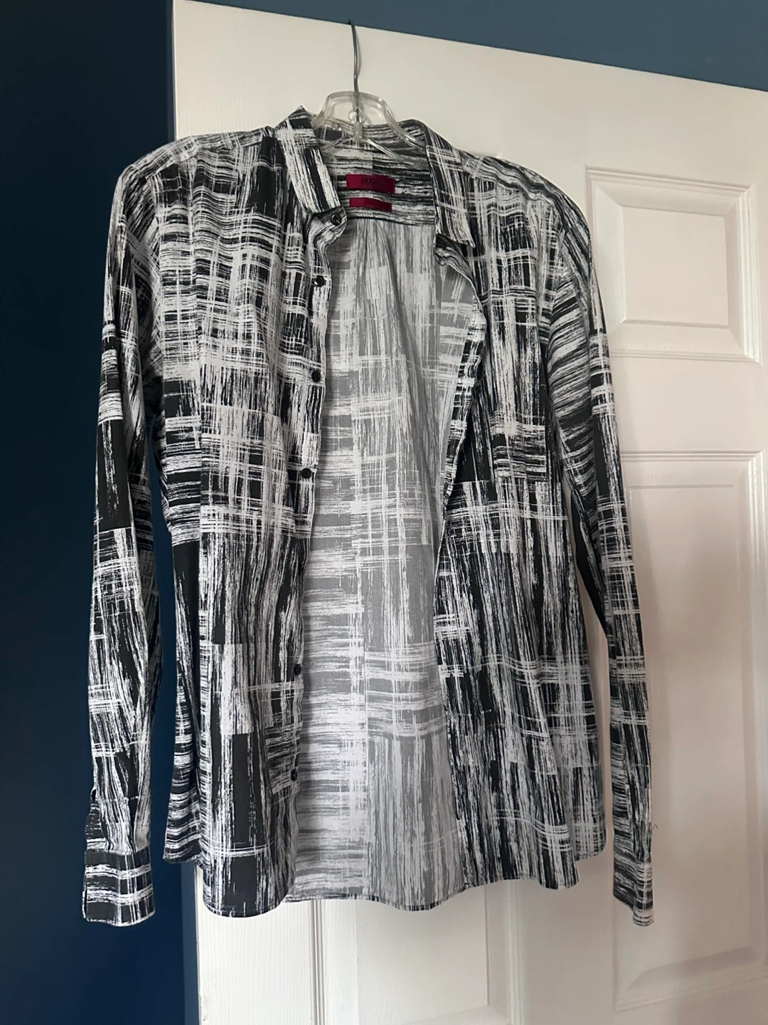 10Selling a Hugo Boss slim fit shirt in size small. The shirt has a black and white abstract pattern. Great for a night out or a casual event!