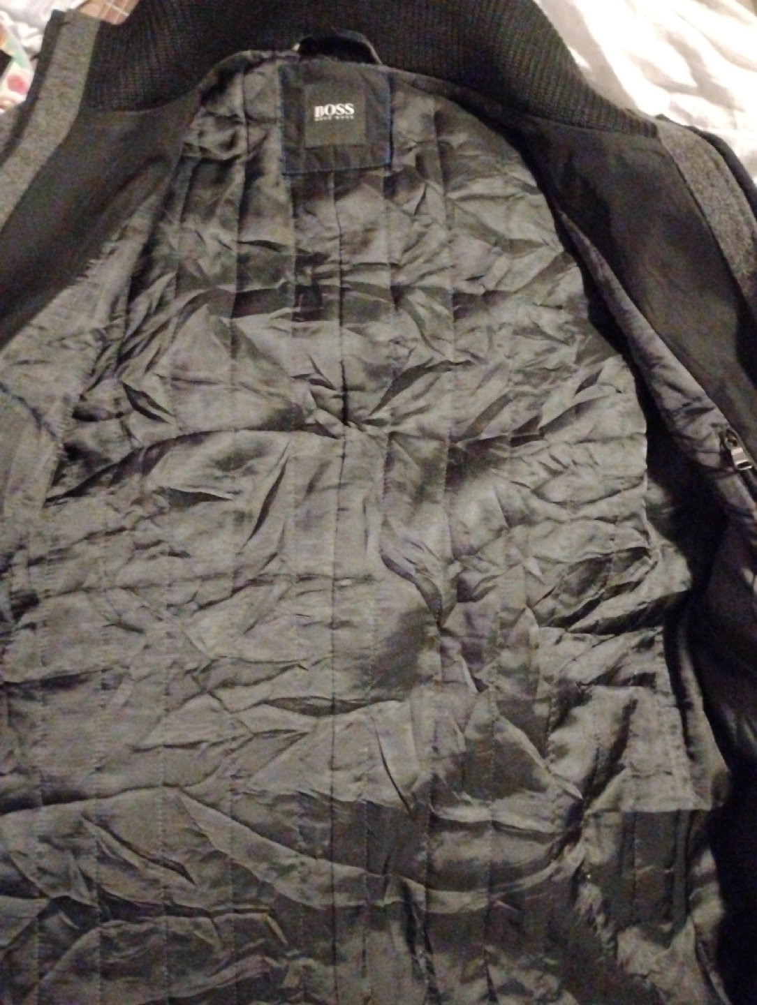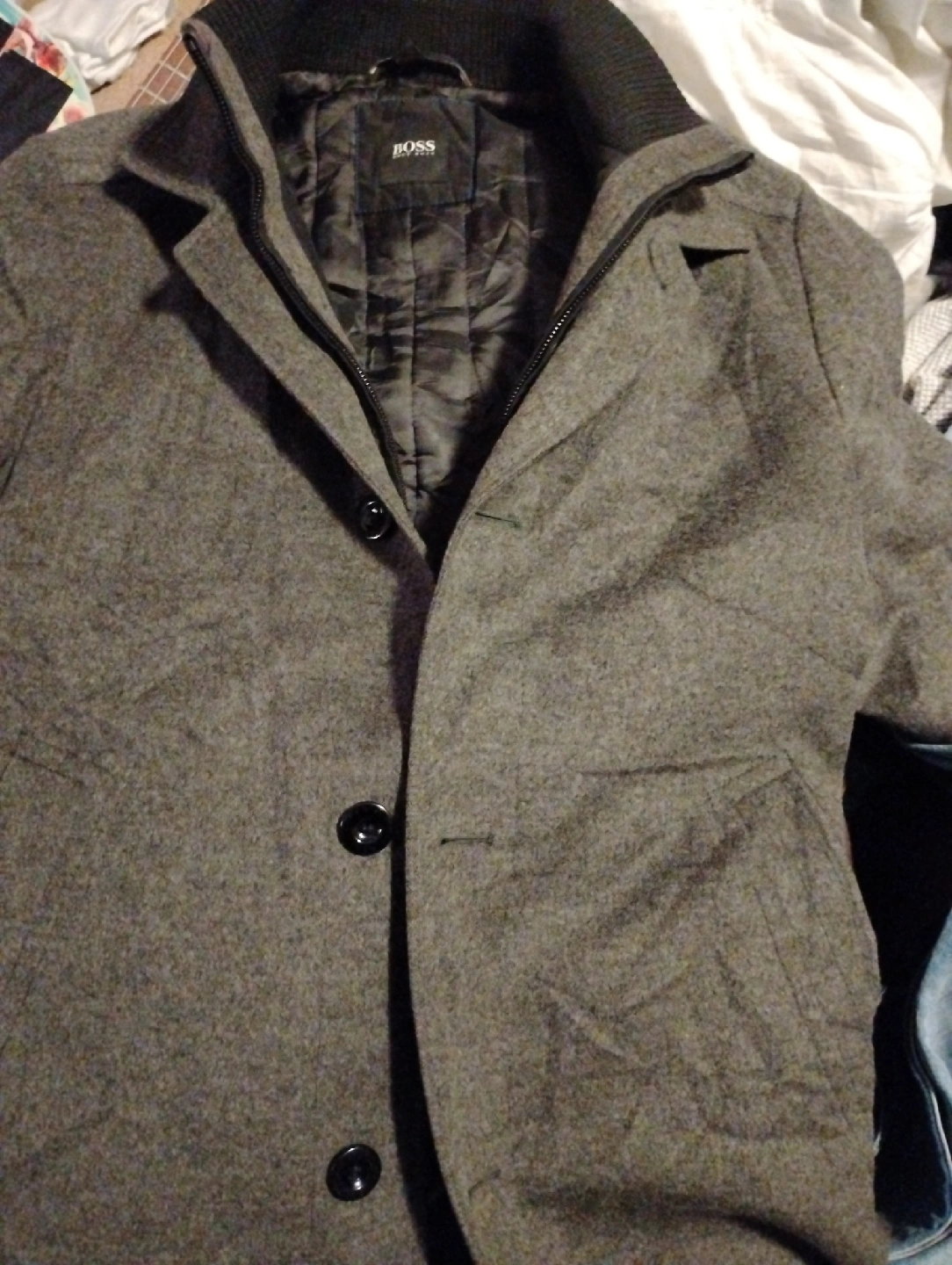 Here's a Hugo Boss overcoat, perfect for staying warm and stylish! It's a wool blend and in great shape. A classic addition to any wardrobe!