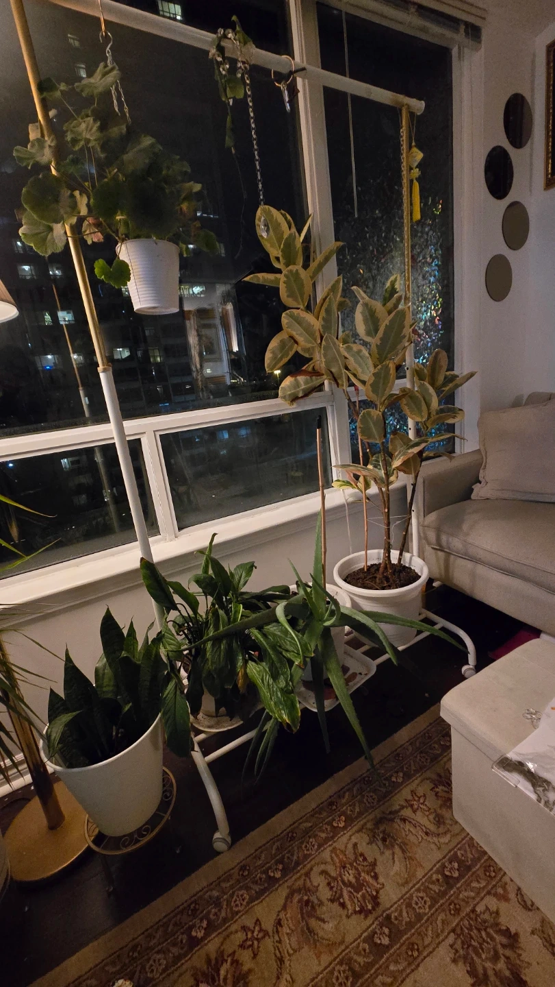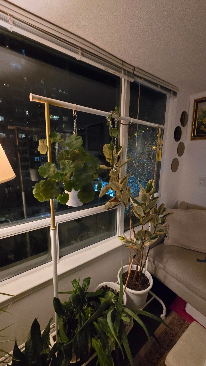 This is an IKEA clothes rack on wheels. I have spray painted some parts gold and used it for hanging my plants