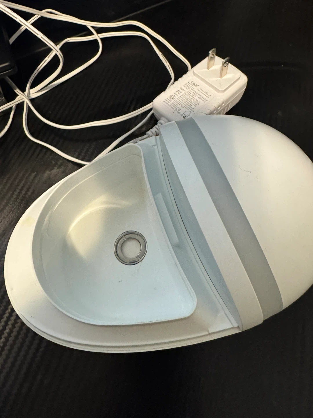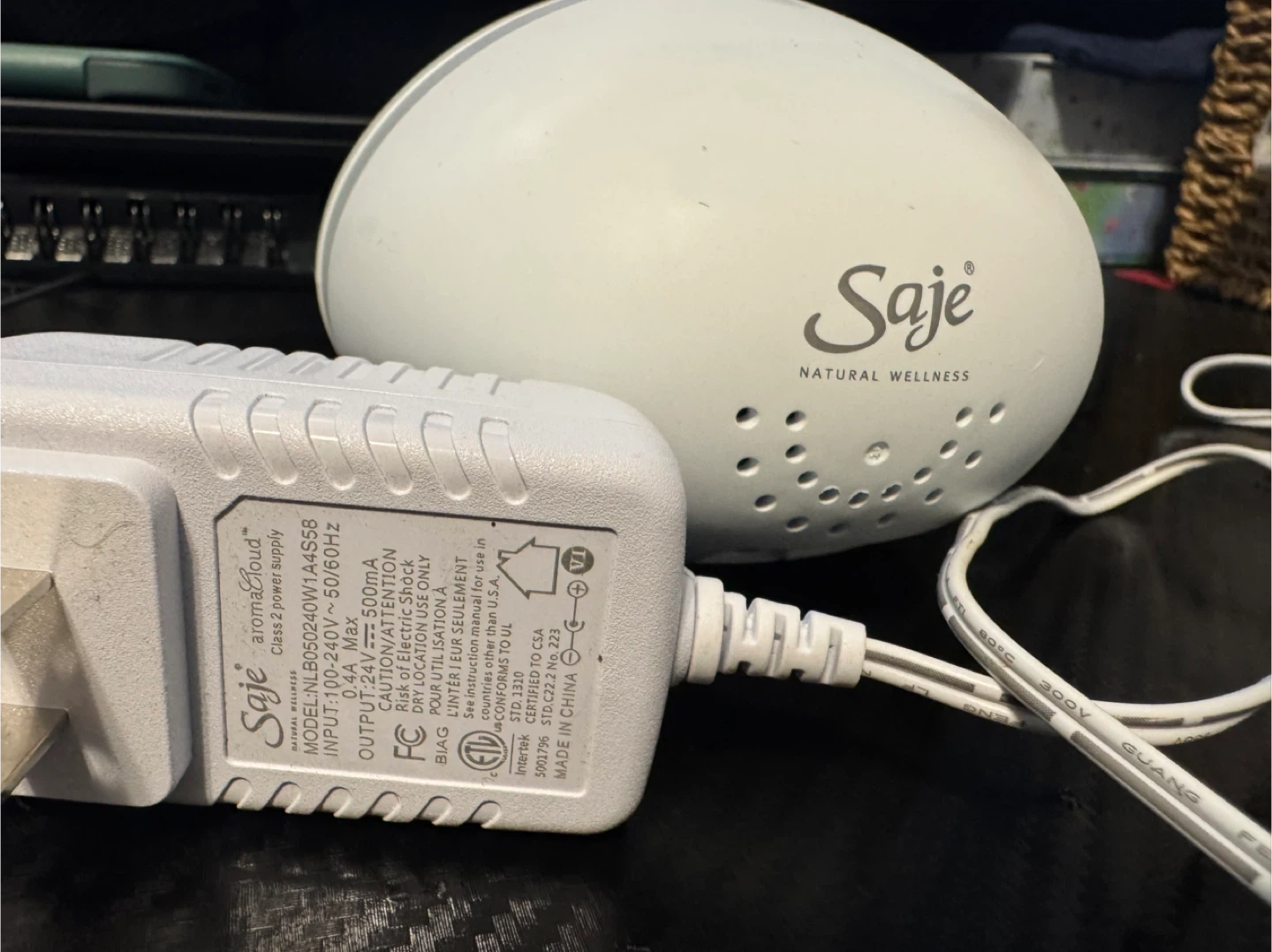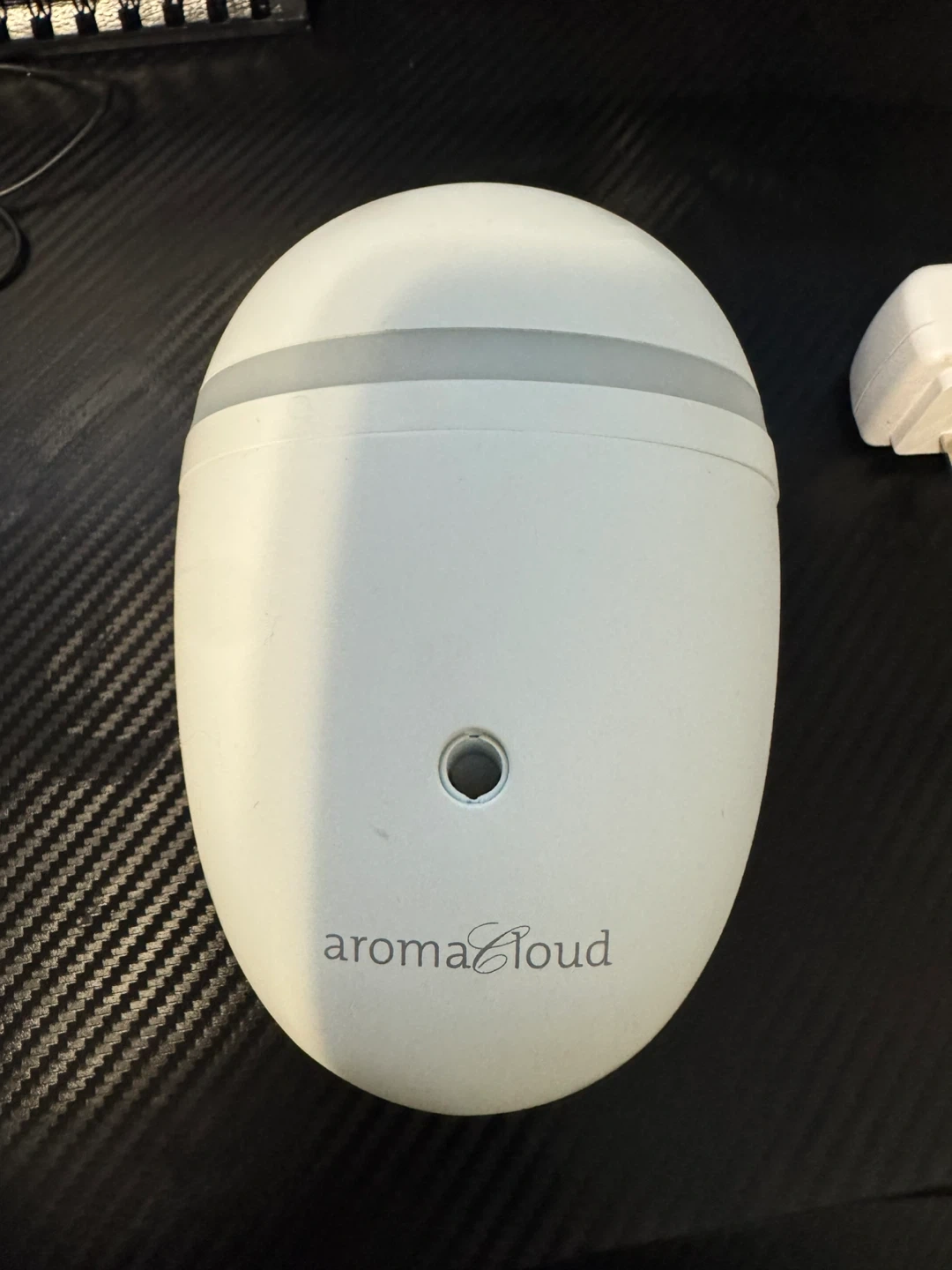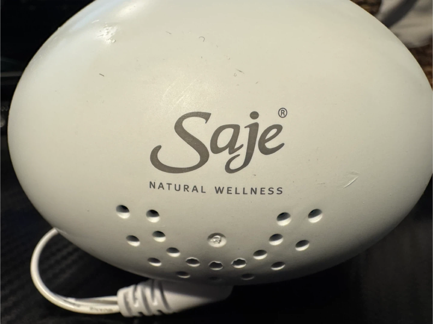 This Saje Aroma Cloud diffuser is white. It comes with its original power adapter. Uses ultrasonic technology to disperse essential oils.
