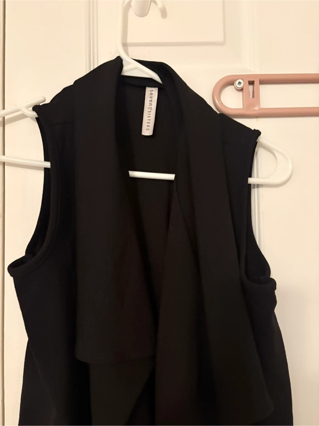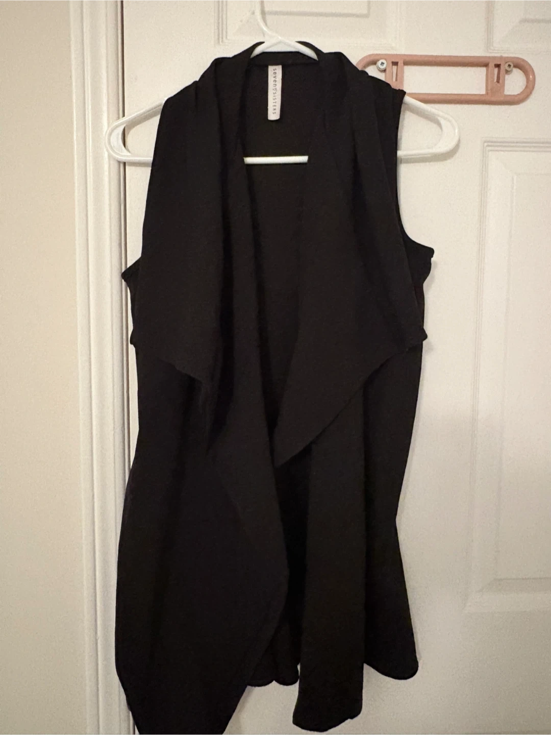 A black sleeveless vest with a waterfall-style front. It's made from a comfortable, flowy fabric. This vest is great for layering over tops.