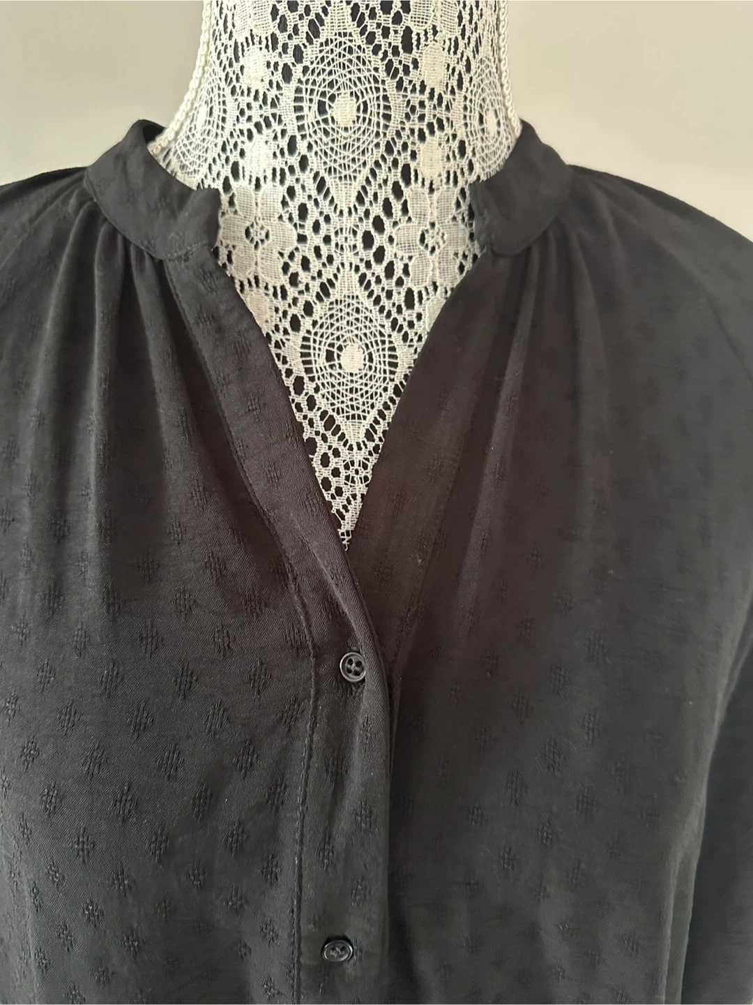 This M&W Collection shirt dress is black with a subtle textured pattern. It features a button-up front and a collared neckline. It's a size small. The fabric has a unique raised diamond pattern throughout.
