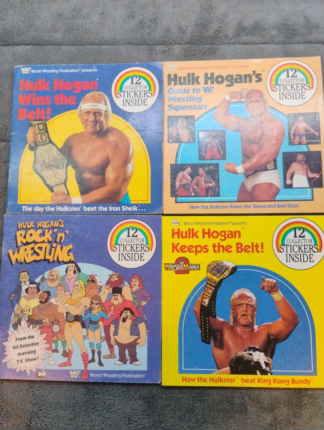 106Selling a set of four vintage Hulk Hogan collector sticker books from the World Wrestling Federation (WWF)! Each book includes 12 collector stickers inside. Titles include: - Hulk Hogan Wins the Belt! - Hulk Hogan's Guide to W.F. Wrestling Superstars - Hulk Hogan's Rock 'n' Wrestling - Hulk Hogan Keeps the Belt!