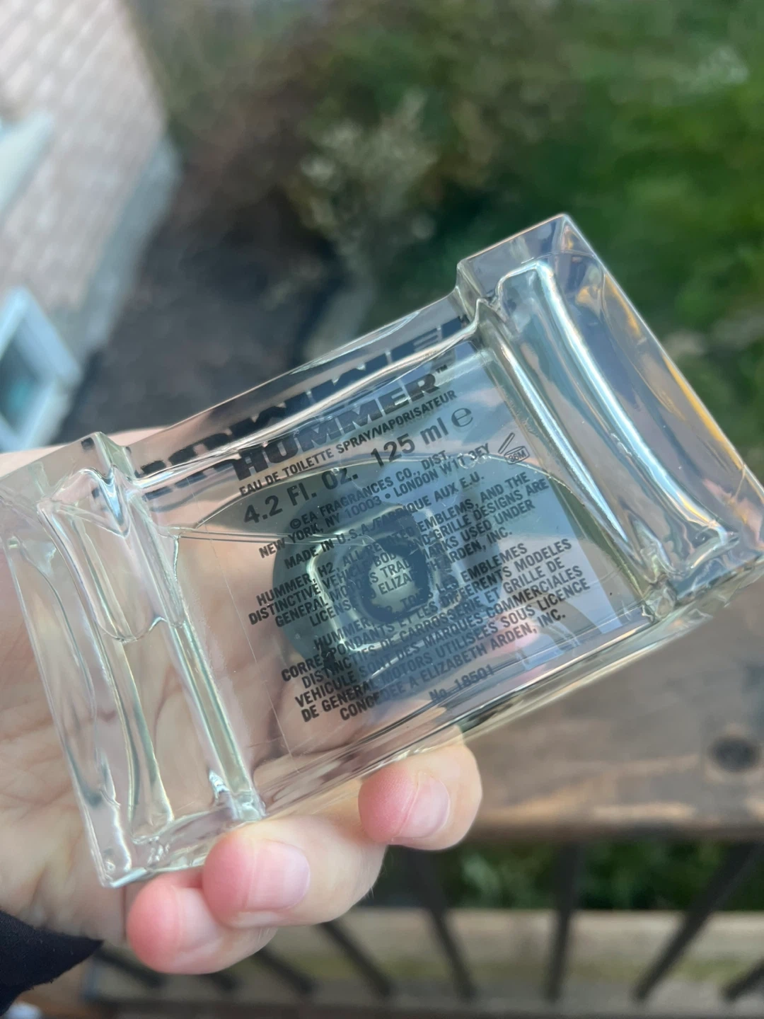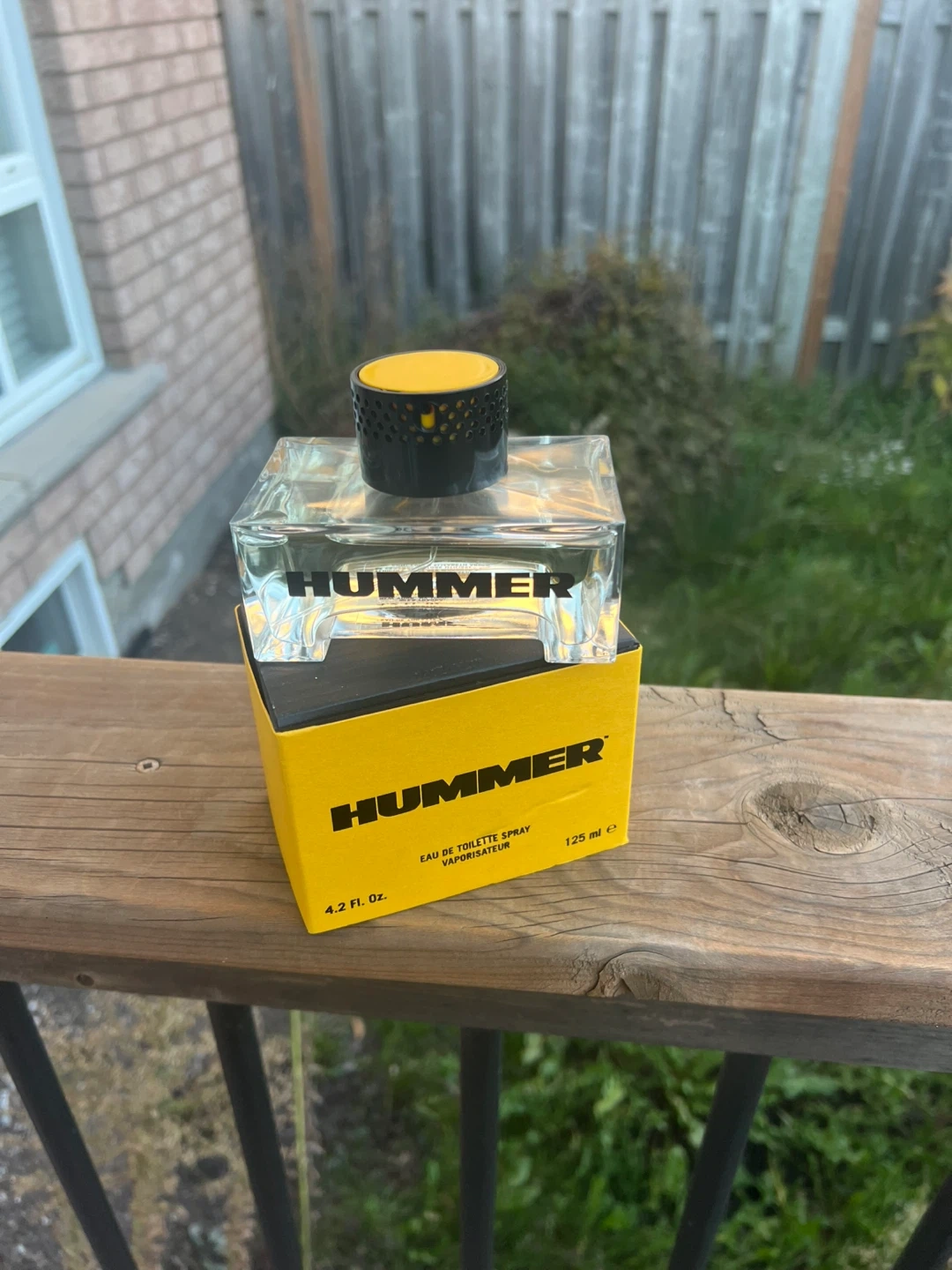 86Selling a Hummer Eau de Toilette Spray. It comes in a 125ml (4.2 fl. oz.) bottle. The box is included. It's a distinctive vehicle body and all related emblems.