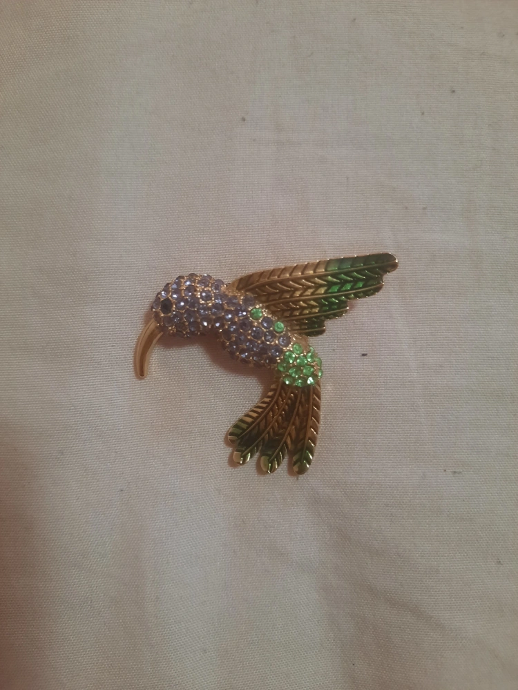 A brooch is a decorative piece of jewelry, typically attached to clothing with a pin or clasp. Hummingbird brooches, like the one shown, are a popular type of animal-themed jewelry. They are often made from metal and decorated with rhinestones, enamel, or other materials to create a colorful and detailed design.