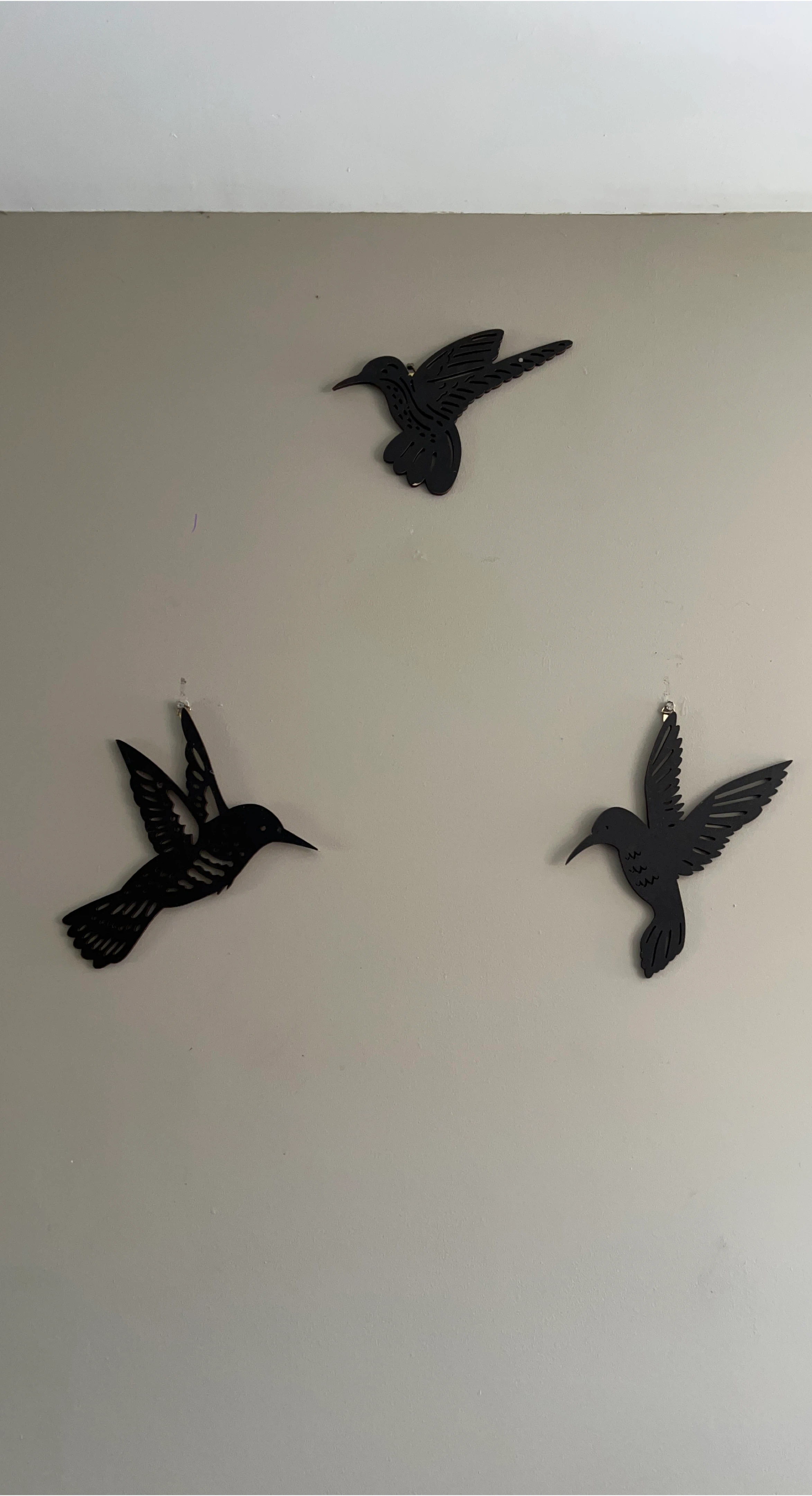 111Add a touch of nature to your home with these cute hummingbird wall decorations! This set includes three black metal hummingbird silhouettes. They are slightly marked and could use a touch up or hang on your wall as is
