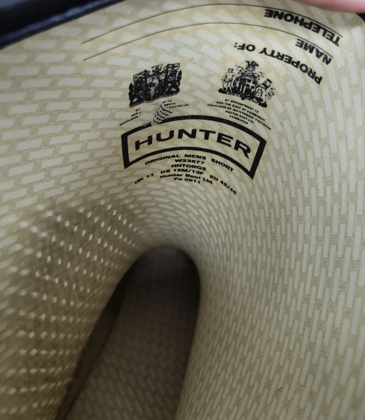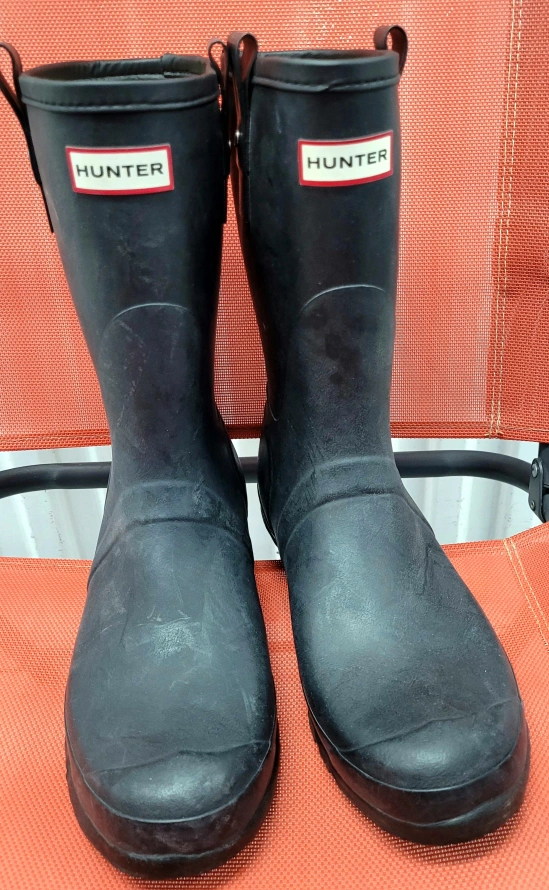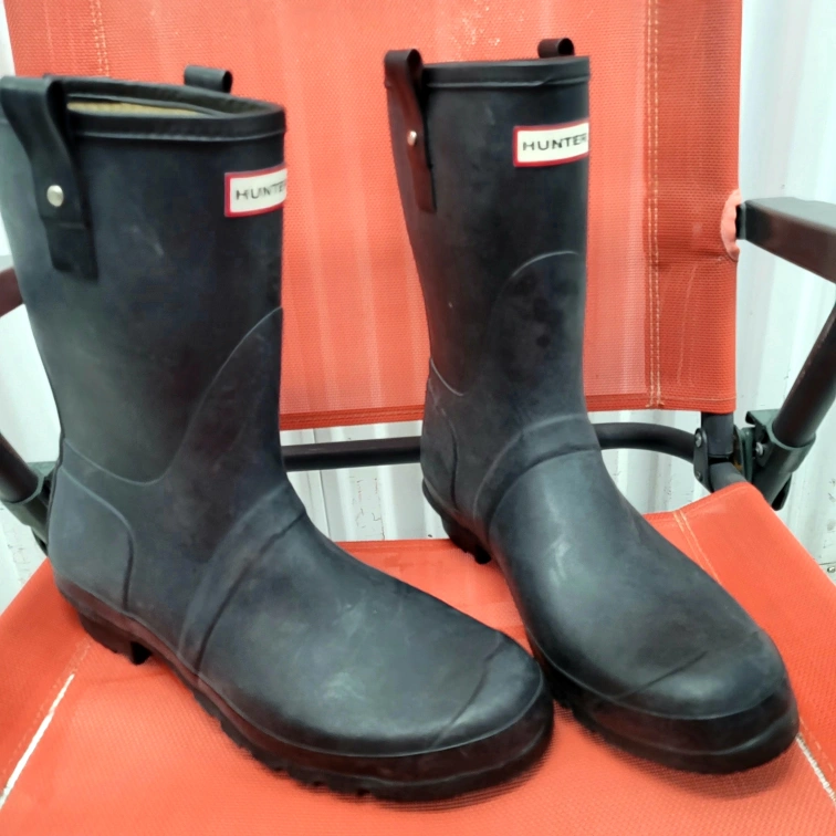 Hunter black rain boots. Crafted from rubber material. Features a pull tab at the top and a classic silhouette. These boots are perfect for a tranquil walk in the rain.