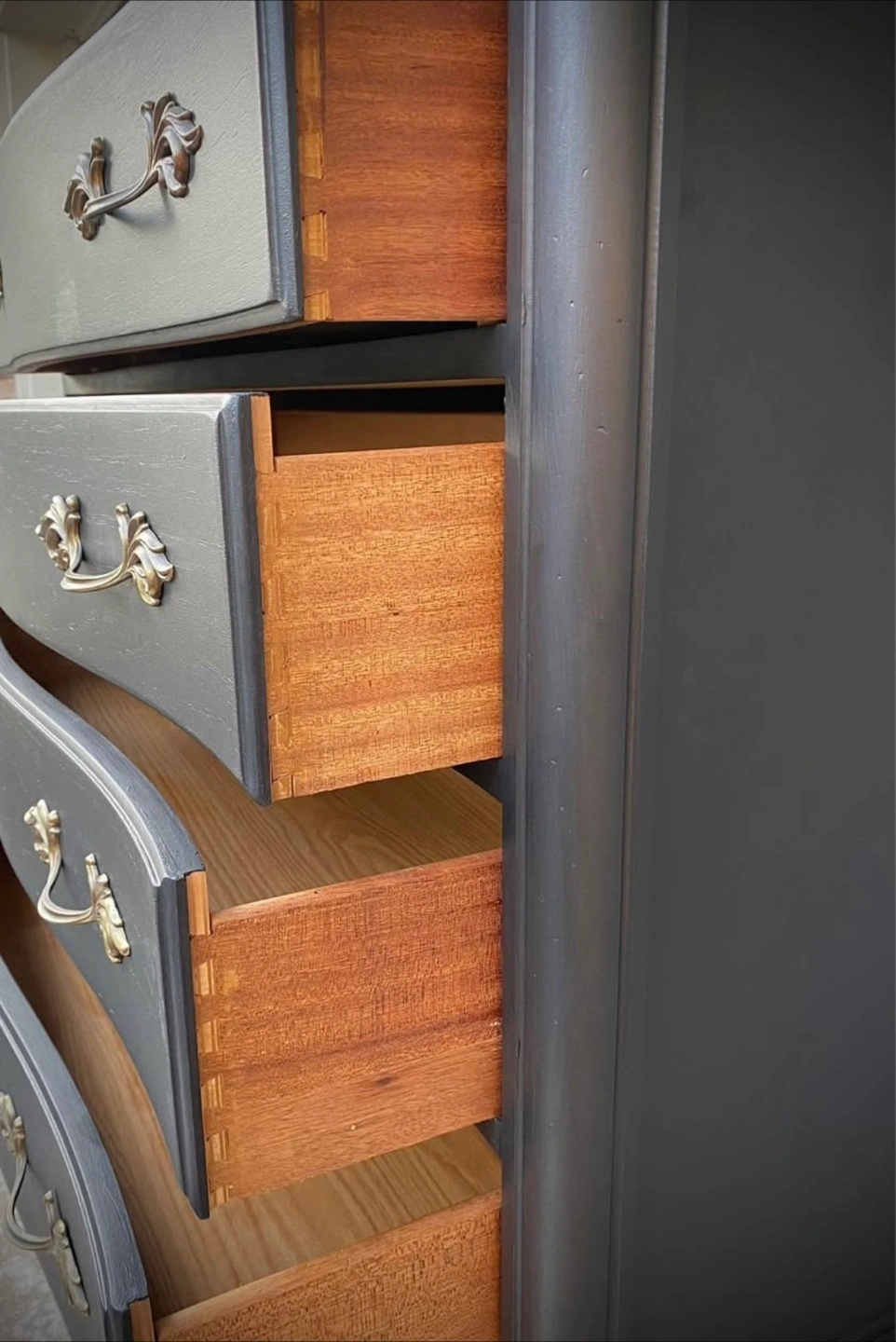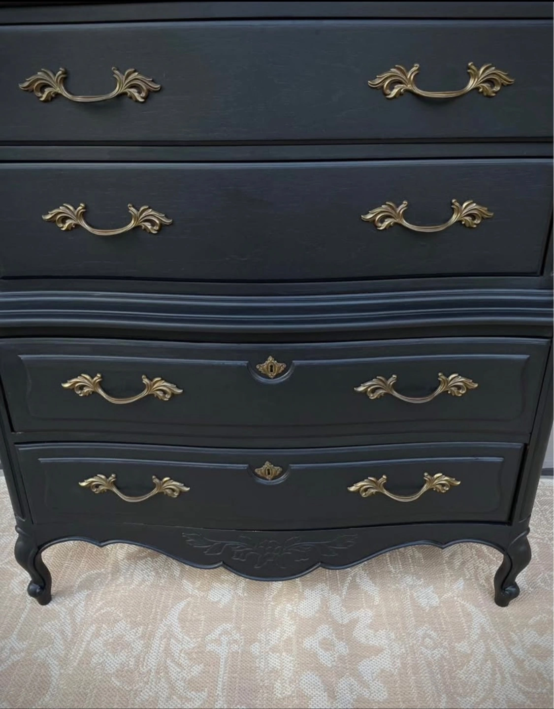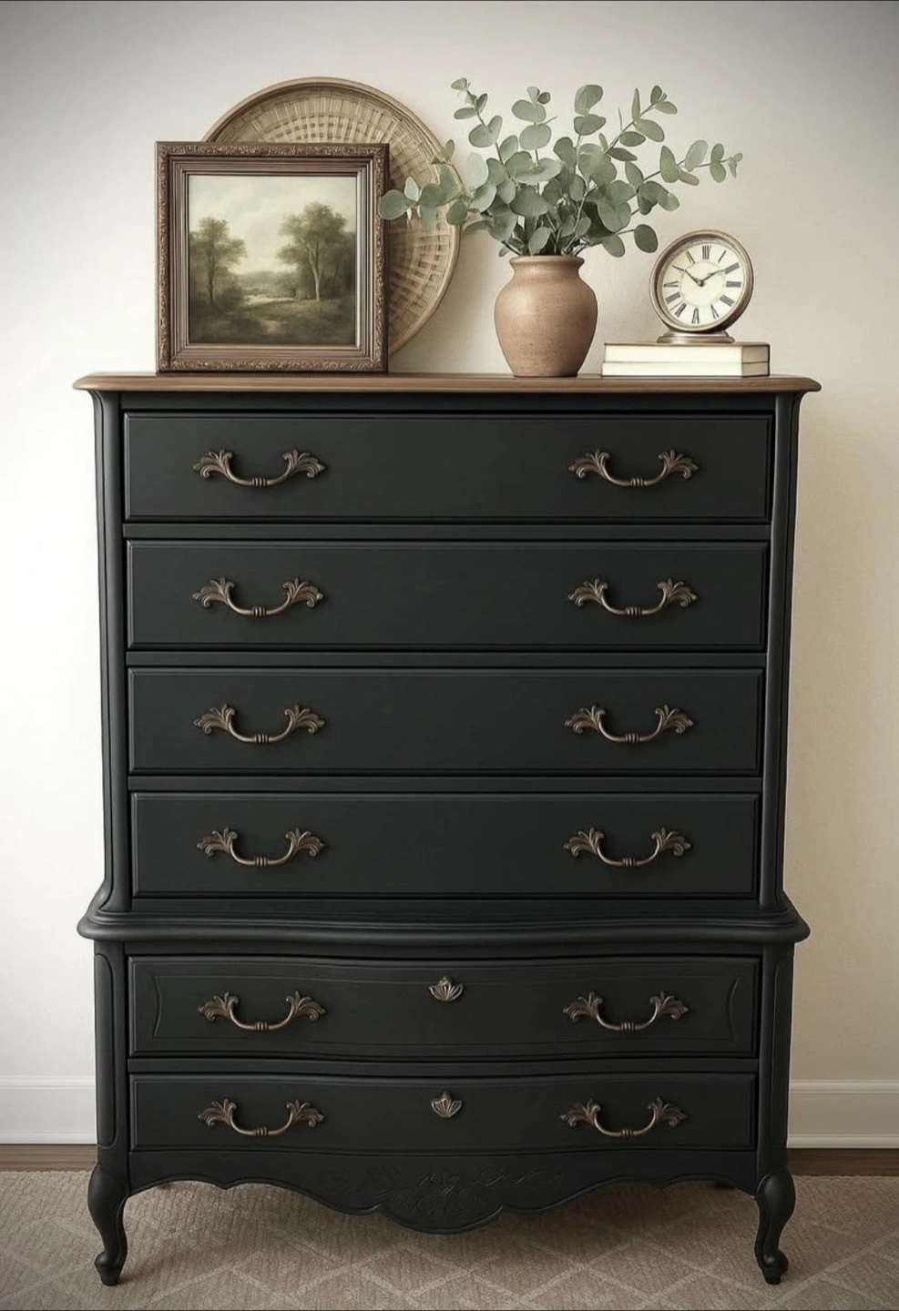 37✨A stunning, modern revival of timeless craftsmanship. This Huntley by Thomasville French Provincial tallboy dresser is built from solid oak and showcases the exceptional quality of mid-century Thomasville design — now reimagined with a sleek, contemporary edge. The body is finished in Fusion’s Coal Black, a rich matte black that brings depth and sophistication. The top is professionally stained in Cappuccino SFO, adding warmth and contrast that highlights the natural oak grain. Original Thomasville hardware has been polished to a subtle gold sheen for a refined, modern finish. Perfect as a statement bedroom piece or upscale storage in any space. Smooth-gliding dovetail drawers offer durability and elegance. 📏 Measurements: 40” W × 18.5” D × 55.5” H 📦 Holds available with a 30% deposit