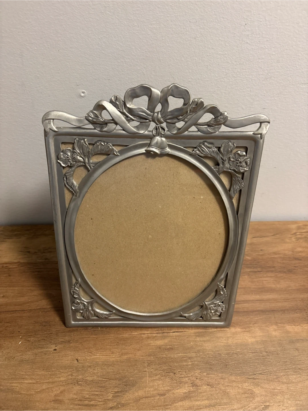 Elegant metal photo frame with a decorative bow and floral detailing. The frame has a tarnished silver-tone finish. It features a circular opening for a photo, and a stand on the back for display.