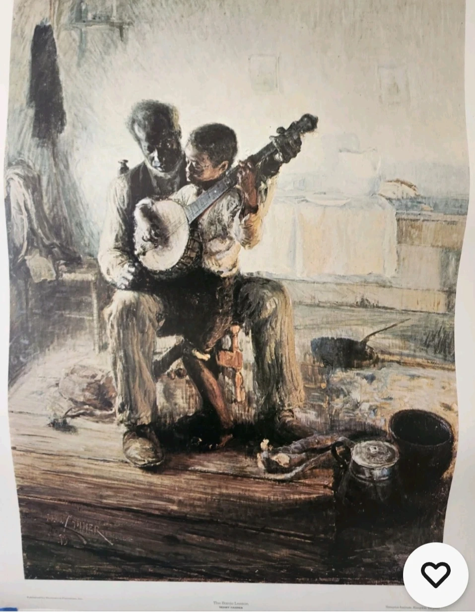 This is a print of 'The Banjo Lesson' painting by Henry Ossawa Tanner. It depicts an elderly Black man teaching a young boy to play the banjo. The artwork captures a moment of shared learning and tradition. It's an iconic piece of American art.
