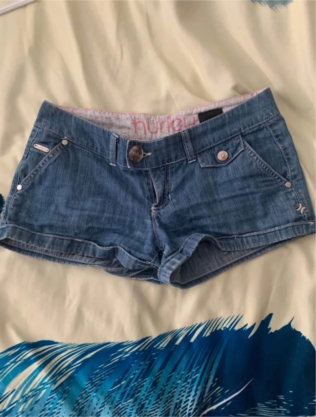 60Pair of Hurley low rise denim shorts in size 3. Super cute! Msg for more information