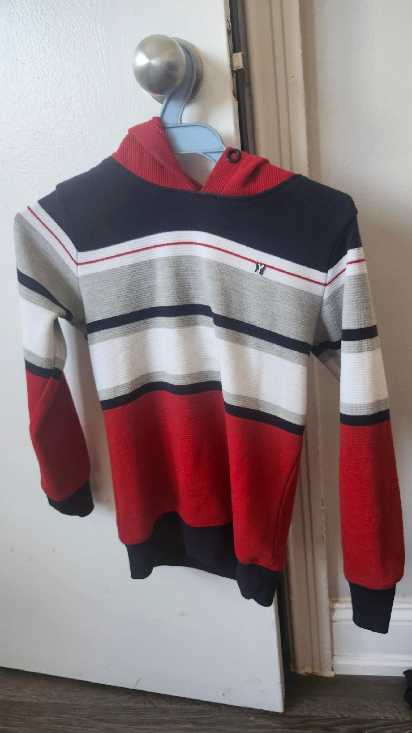 Here's a Hurley hoodie with a cool striped design! It features red, white, grey, and navy blue stripes. The Hurley logo is subtly embroidered on the chest. Perfect for layering or wearing on its own