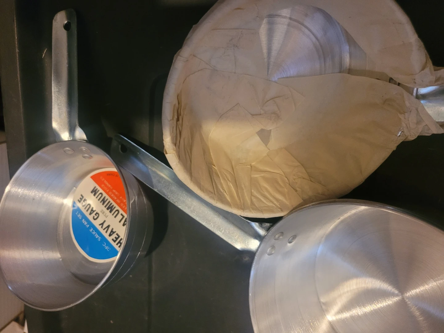 This is a 3-piece sauce pan set made of heavy gauge aluminum. It includes original packaging. Aluminum material.