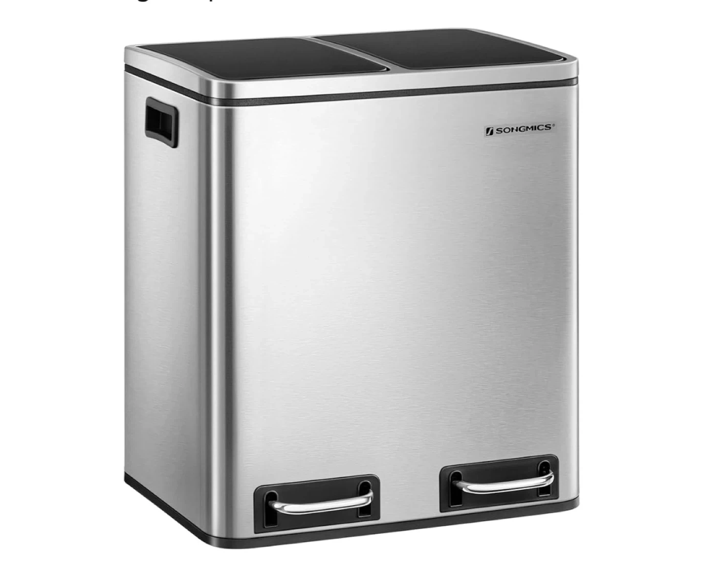 This SONGMICS dual compartment trash can is made of stainless steel. It features two 4-gallon inner buckets, each with its own lid. Each compartment has a pedal for easy opening. It's 16.1" wide, 12.4" deep, and 28.9" tall with the lid open.
