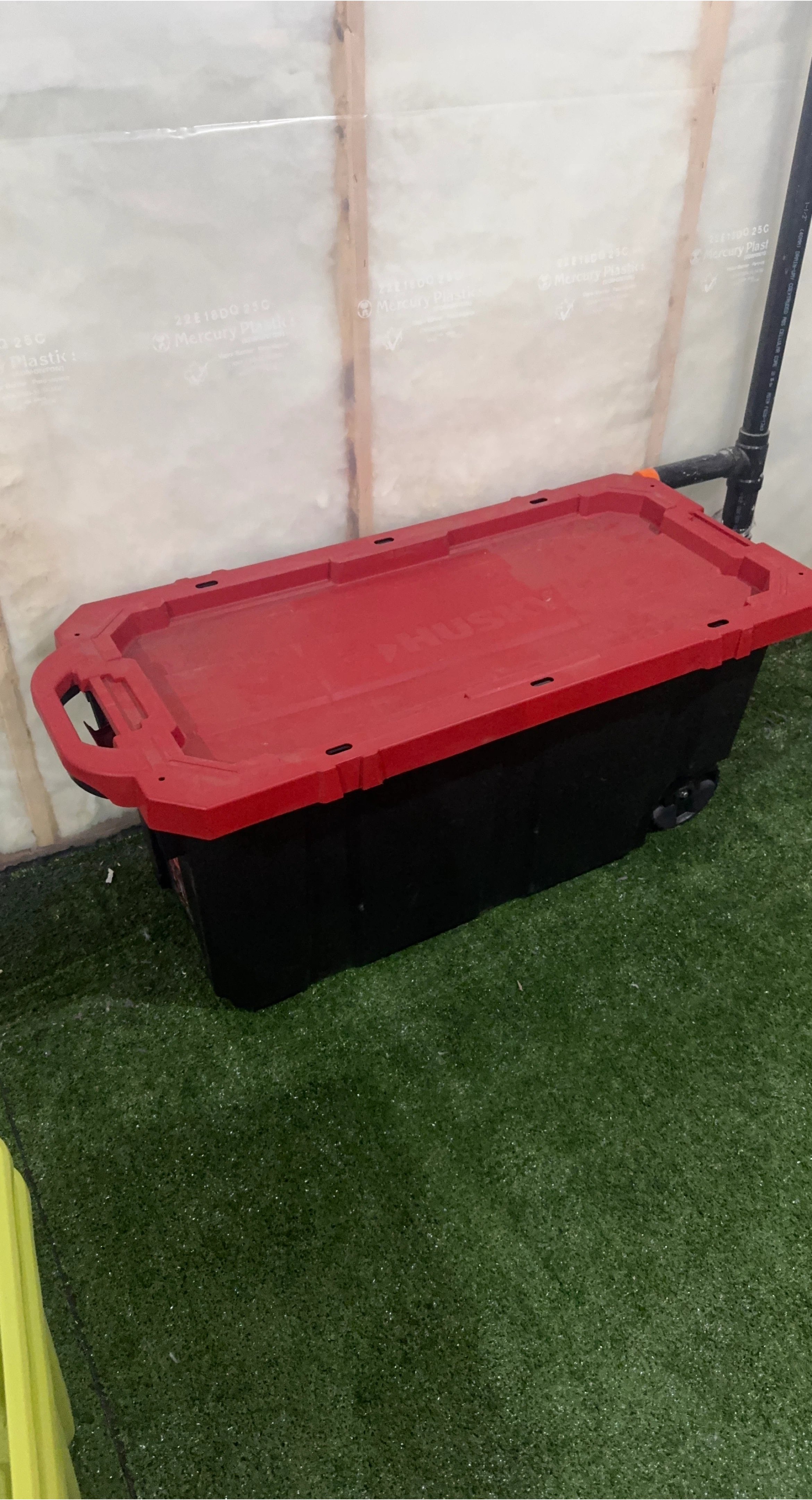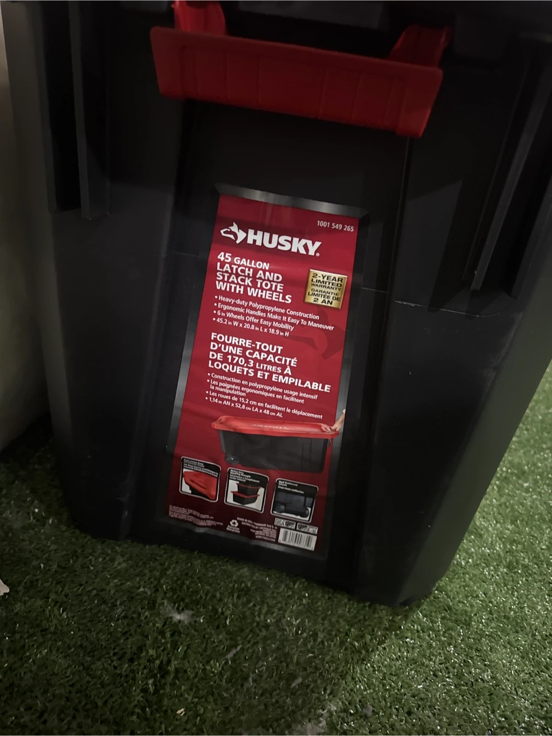 Selling a Husky 45-gallon latch tote with wheels. I have two available. It's great for heavy-duty polypropylene construction and has dynamic handle mobility. The size is 25 in. W x 20.8 in. D x 18 in. H (63.5 cm L x 52.8 cm L x 45.8 cm Al)