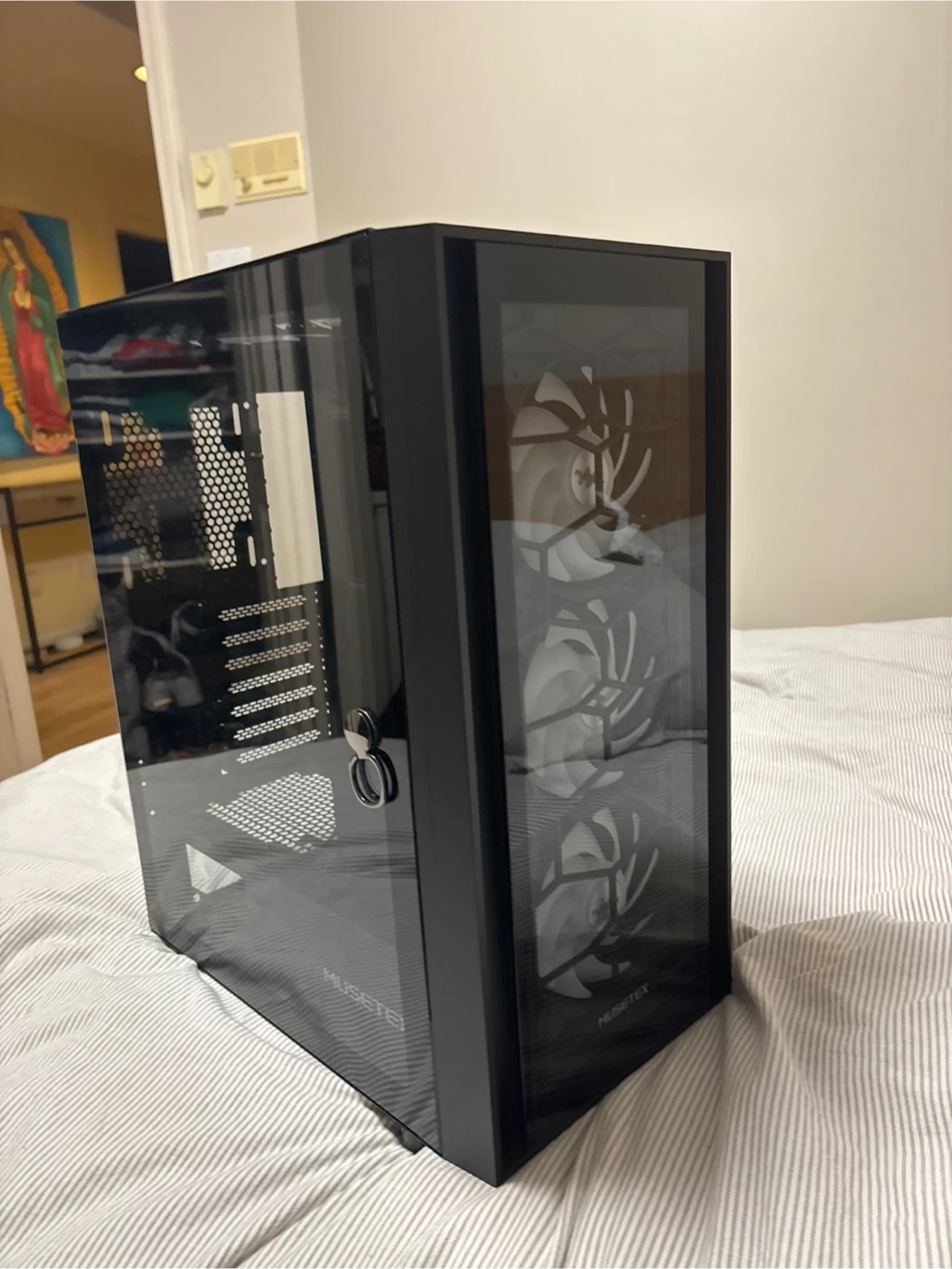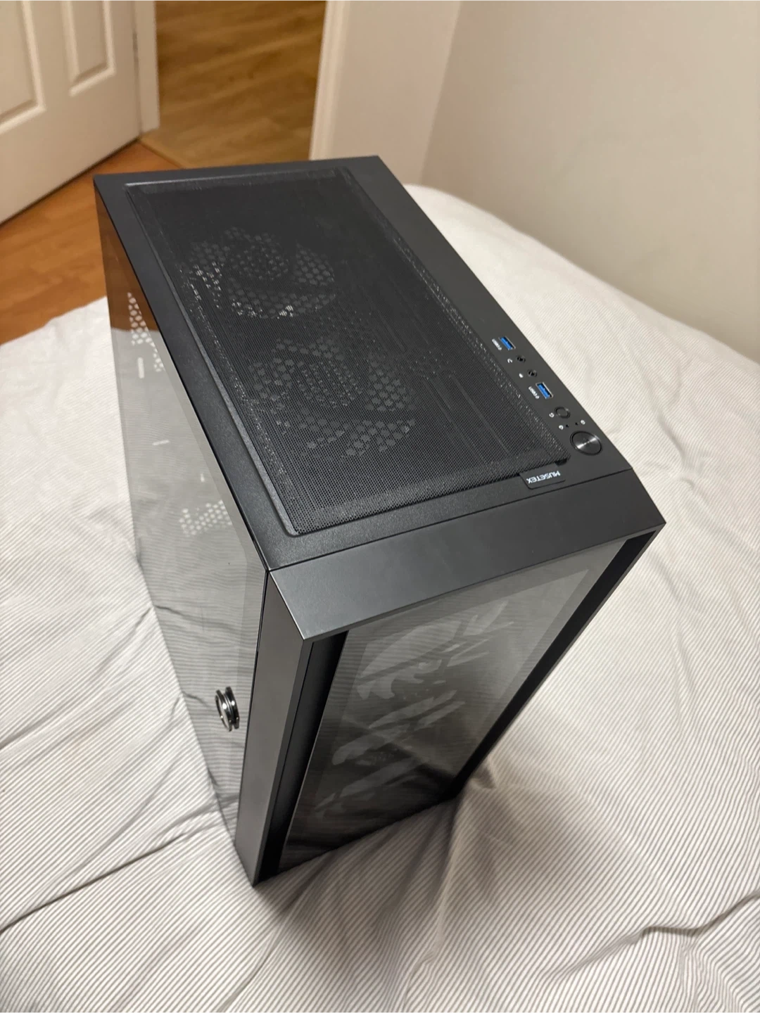 Selling a HUSTETEX PC case with 6 pre installed fans. in great condition! It features a sleek design with a tempered glass side panel, perfect for showing off your components. It supports multiple fans and radiators for optimal cooling. It is a mid-tower case, offering ample space for your components and easy cable management