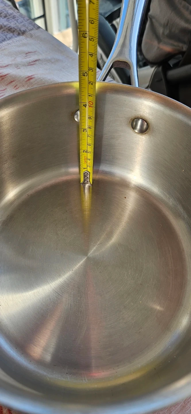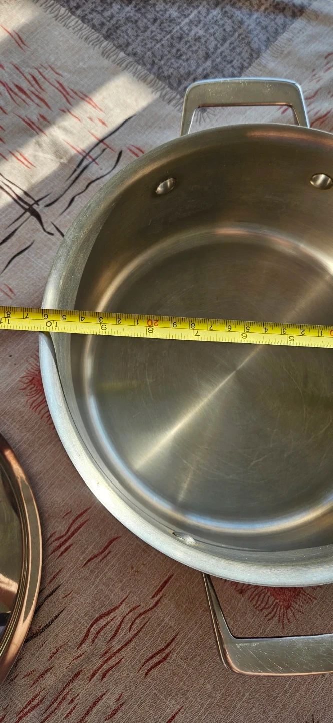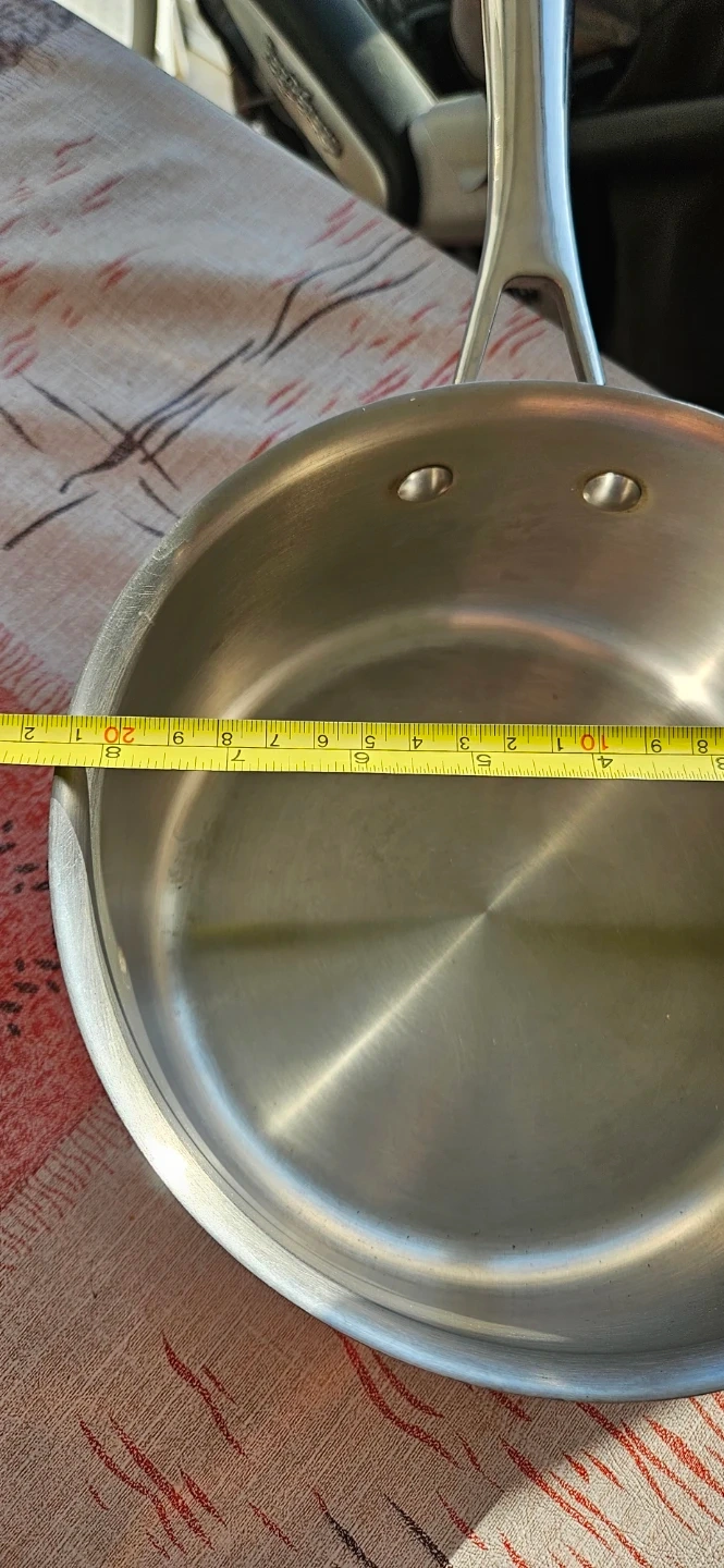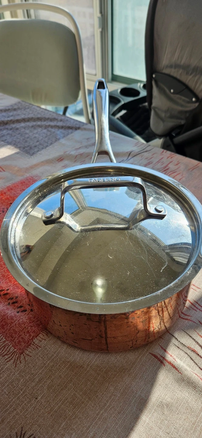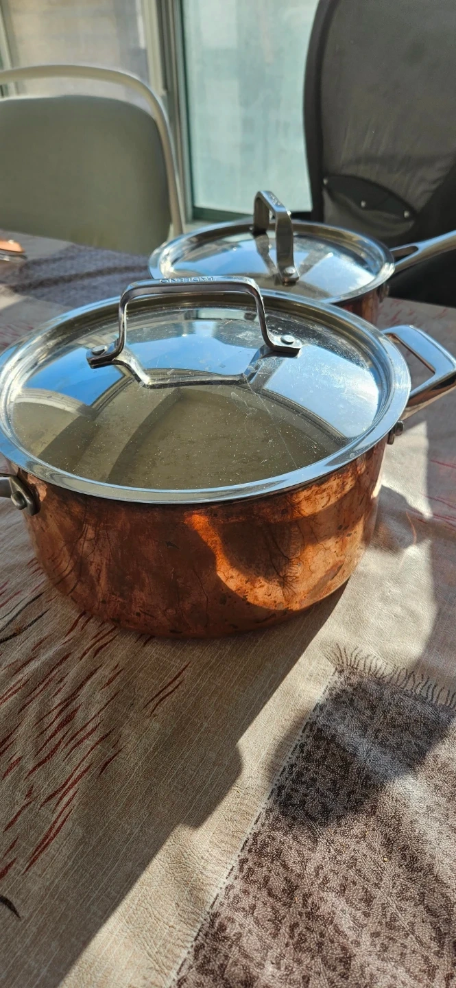 Set of two copper-bottomed saucepans. One saucepan measures approximately 8 inches in diameter and 3.5 inches deep. The other measures approximately 6 inches in diameter and 3 inches deep. Both include glass lids.
