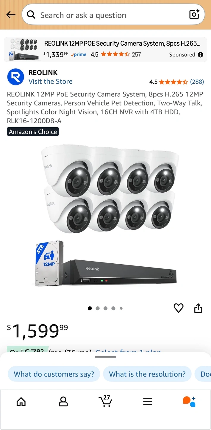 16Ch/4TB Security Camera System NVR/8Pcs H.265/12MP 2way Night V