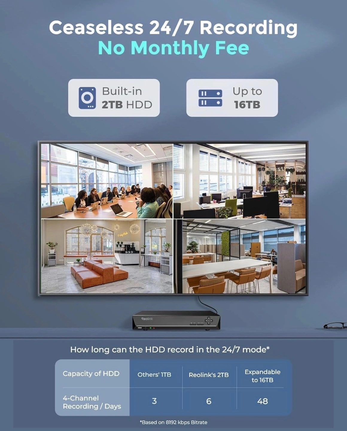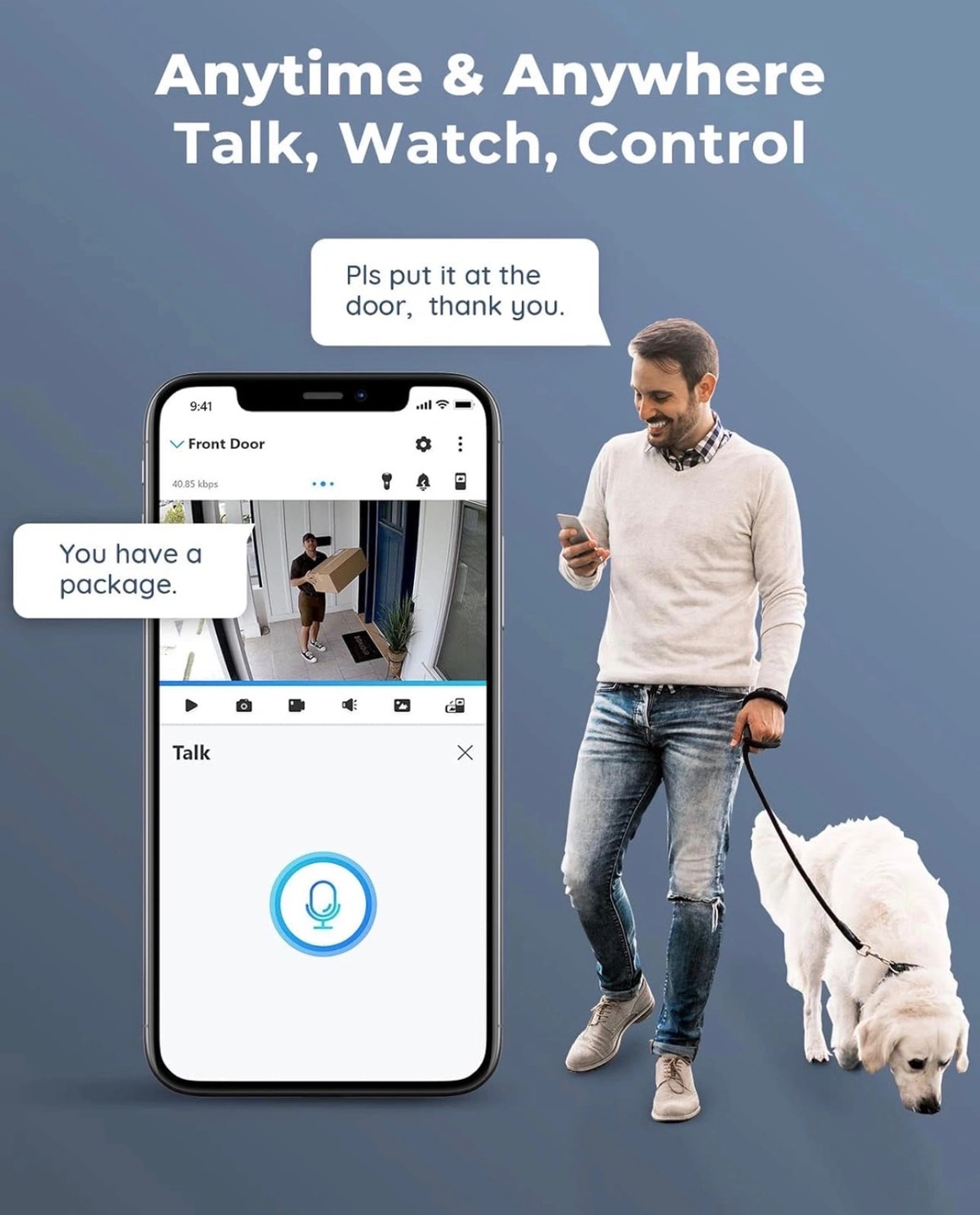 TWO-WAY TALK -- The 12MP camera of this home security system has a speaker built-in for two-way communication with your family as well as threat deterrence. Simply press a button on Reolink App or Client to talk.