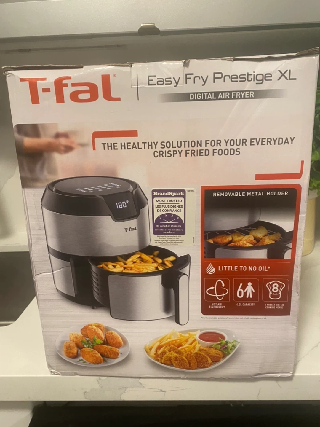 T-fal Easy Fry Prestige XL digital air fryer for healthy, crispy fried foods. It features 4.2L capacity and a removable metal holder. Little to no oil is needed for cooking!