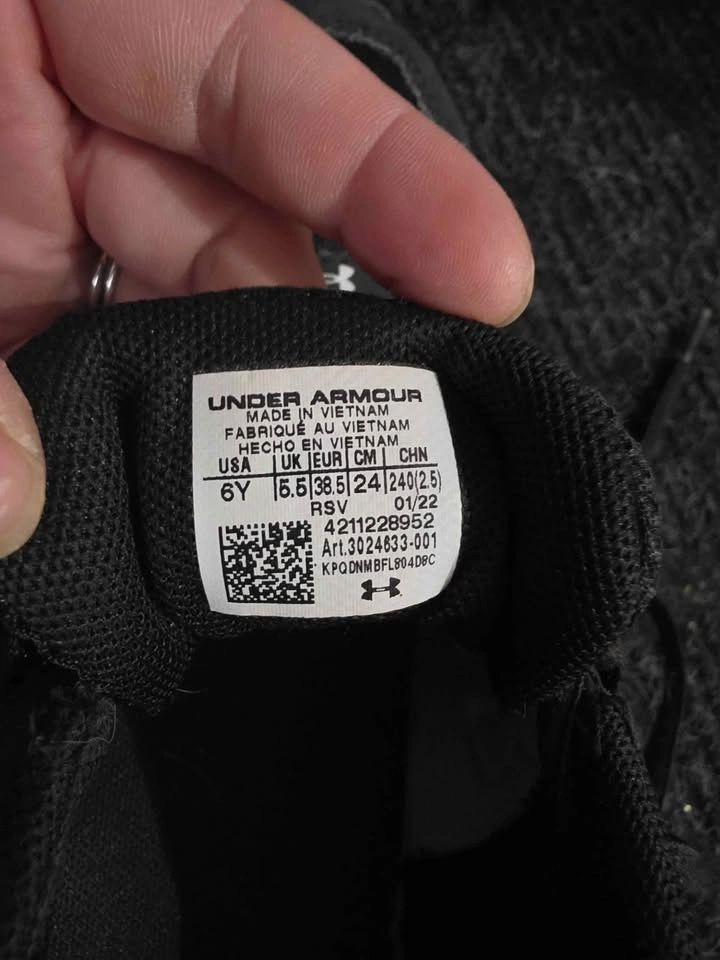Barely used, black color makes it a timeless shoe, gender neutral sneaker. Brand is Under Armour - size 6 youth or close to a size 6 women's.