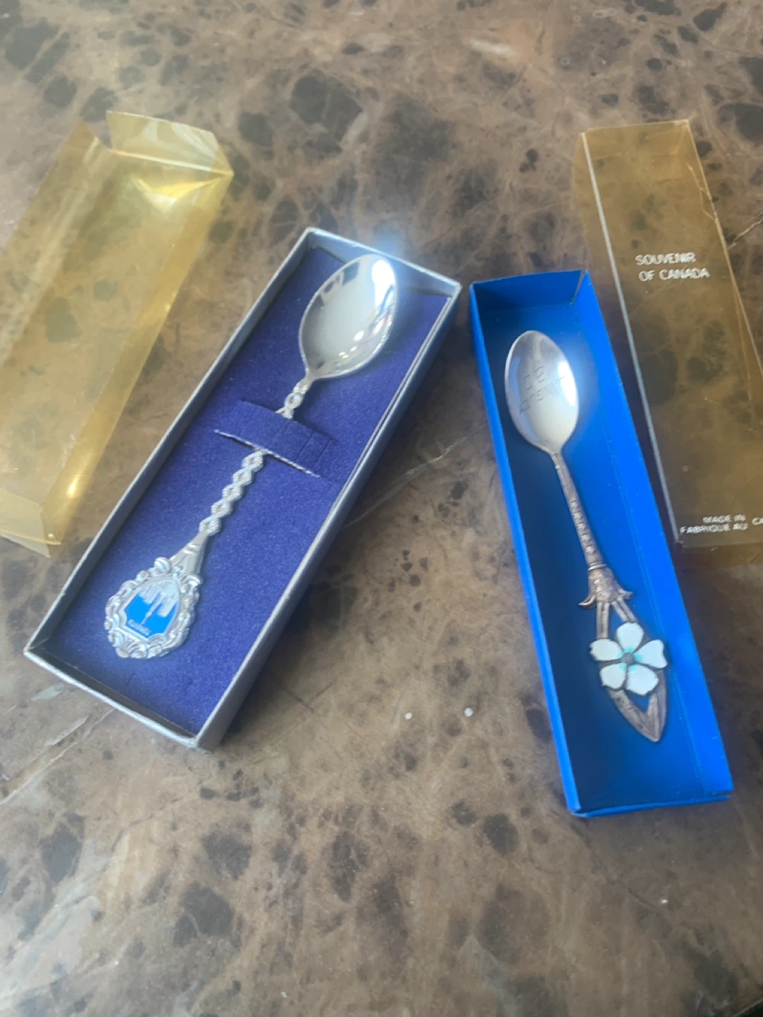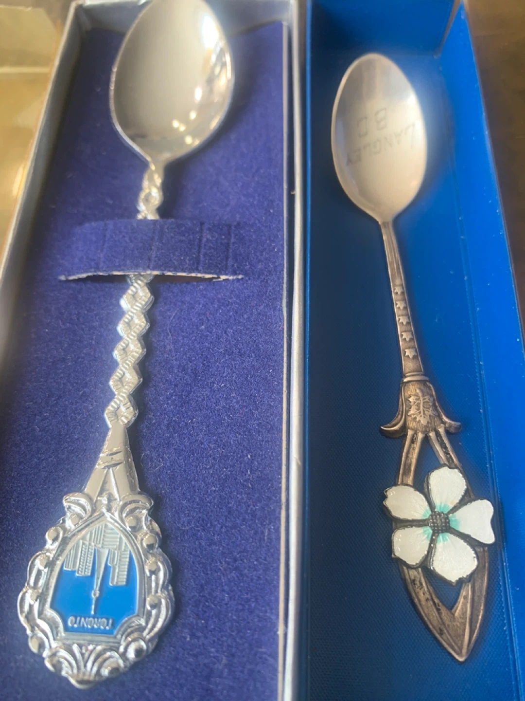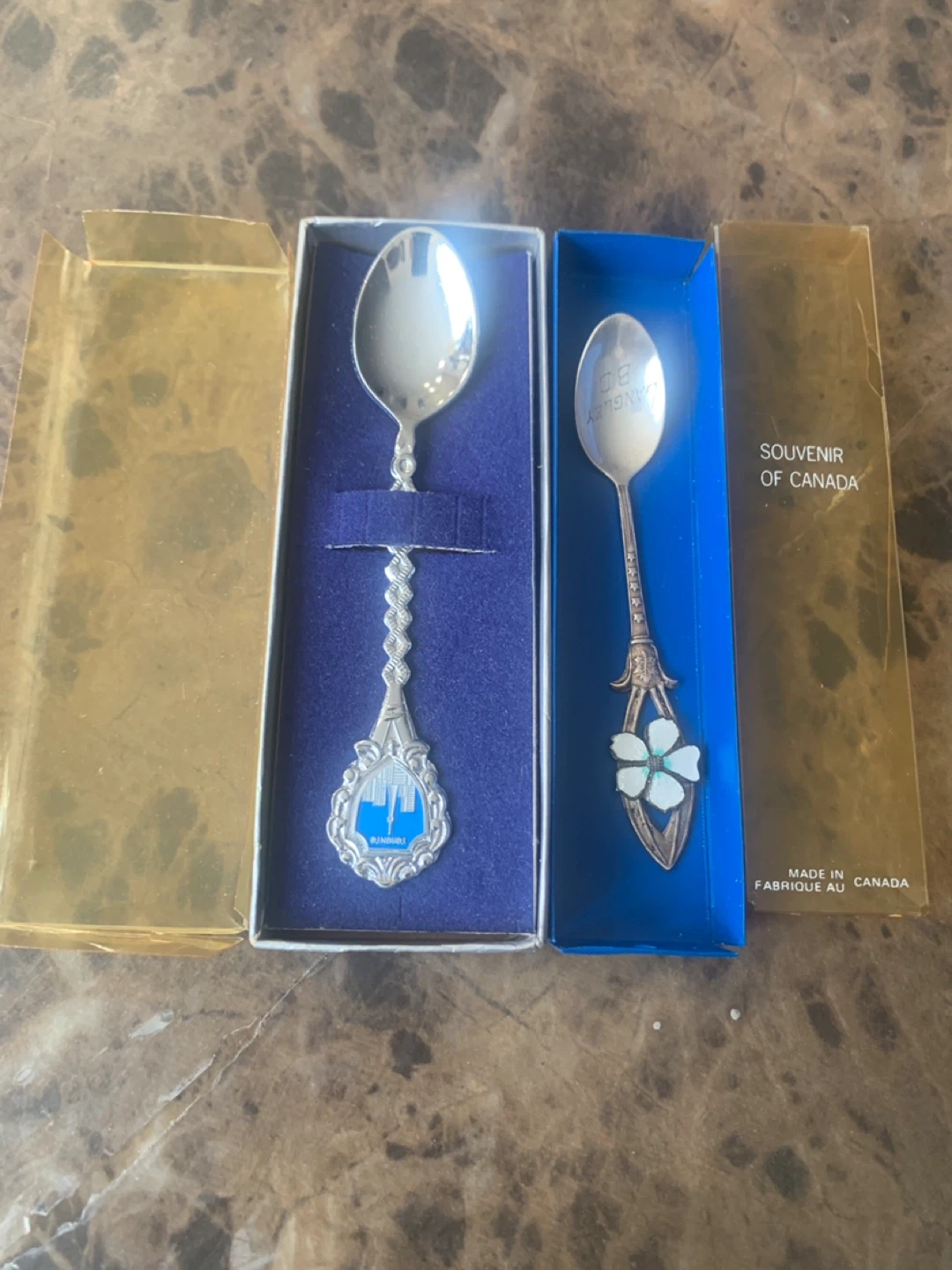 Two souvenir spoons, one featuring Toronto's skyline and the other a floral design with 'Souvenir of Canada' on the packaging. Both come in their original display boxes.