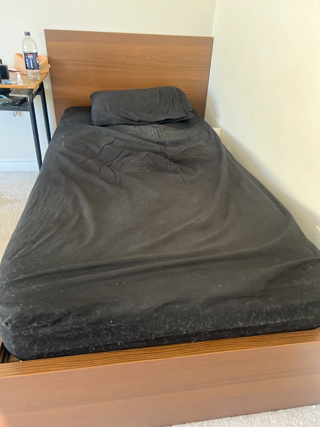 This is a simple wooden bed frame with a matching headboard. It comes with a black mattress cover. It's a sturdy frame that would be great for a bedroom.