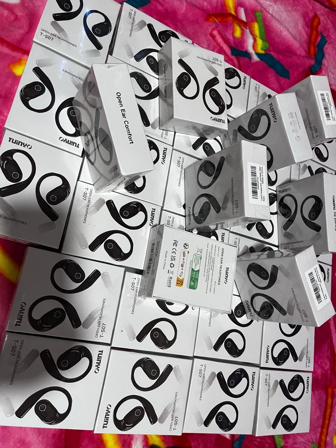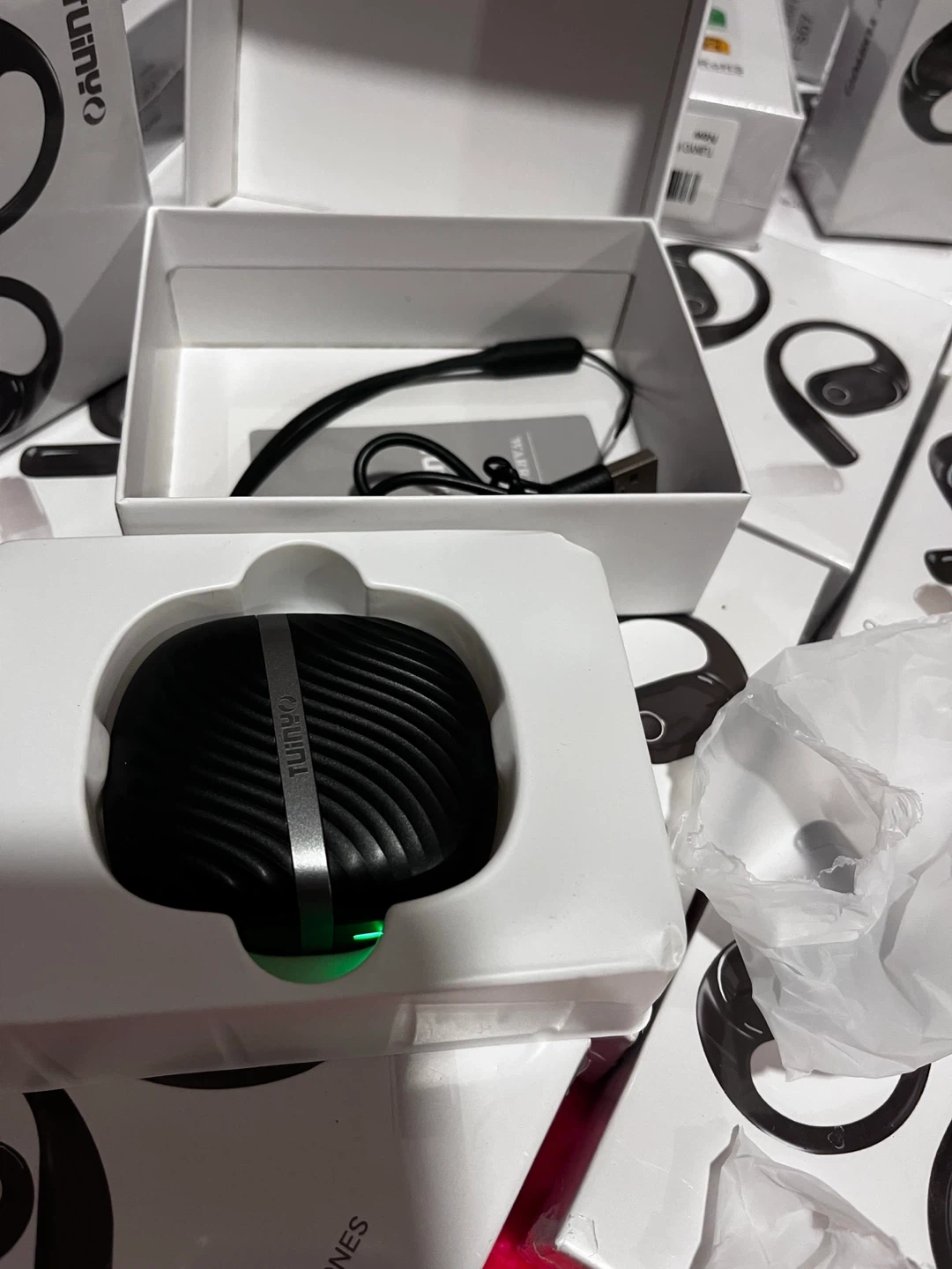 These TUIYUO T-S07 headphones feature an open ear design for comfort. They come with a charging case and USB cable. Included components are the headphones, charging case, and USB cable.