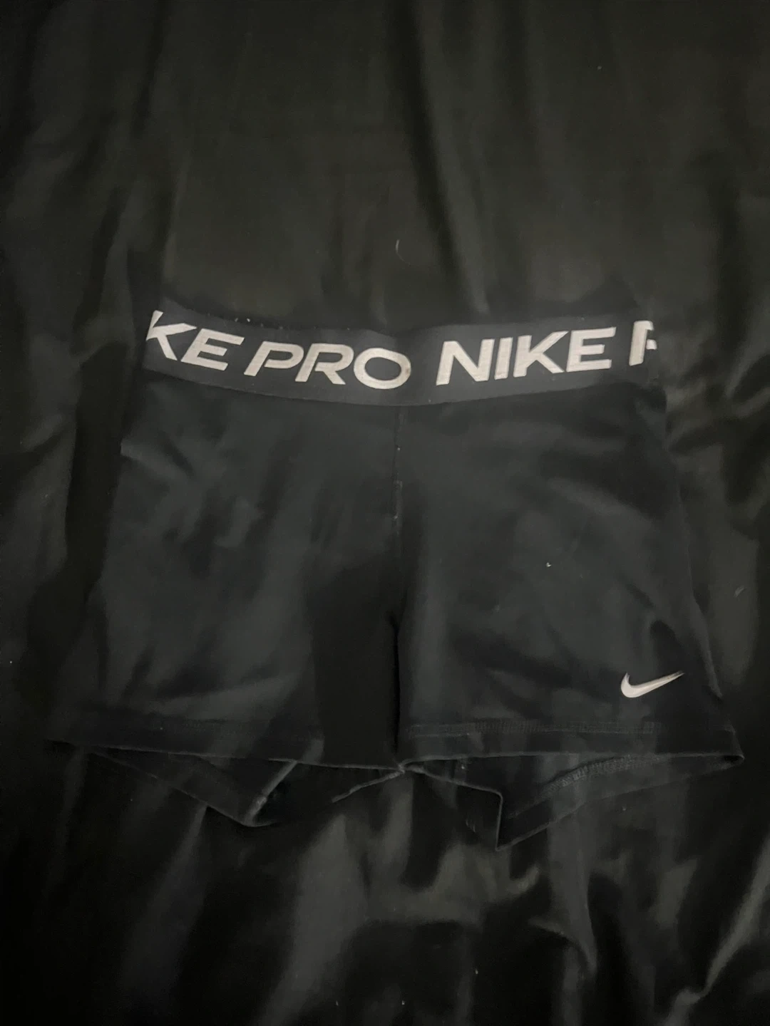 Black Nike Pro compression shorts with a branded waistband. These shorts are designed for athletic performance. Suitable for a variety of sports and workouts. Size small