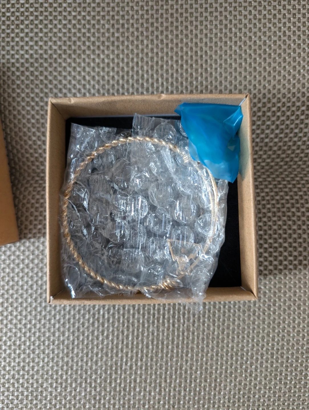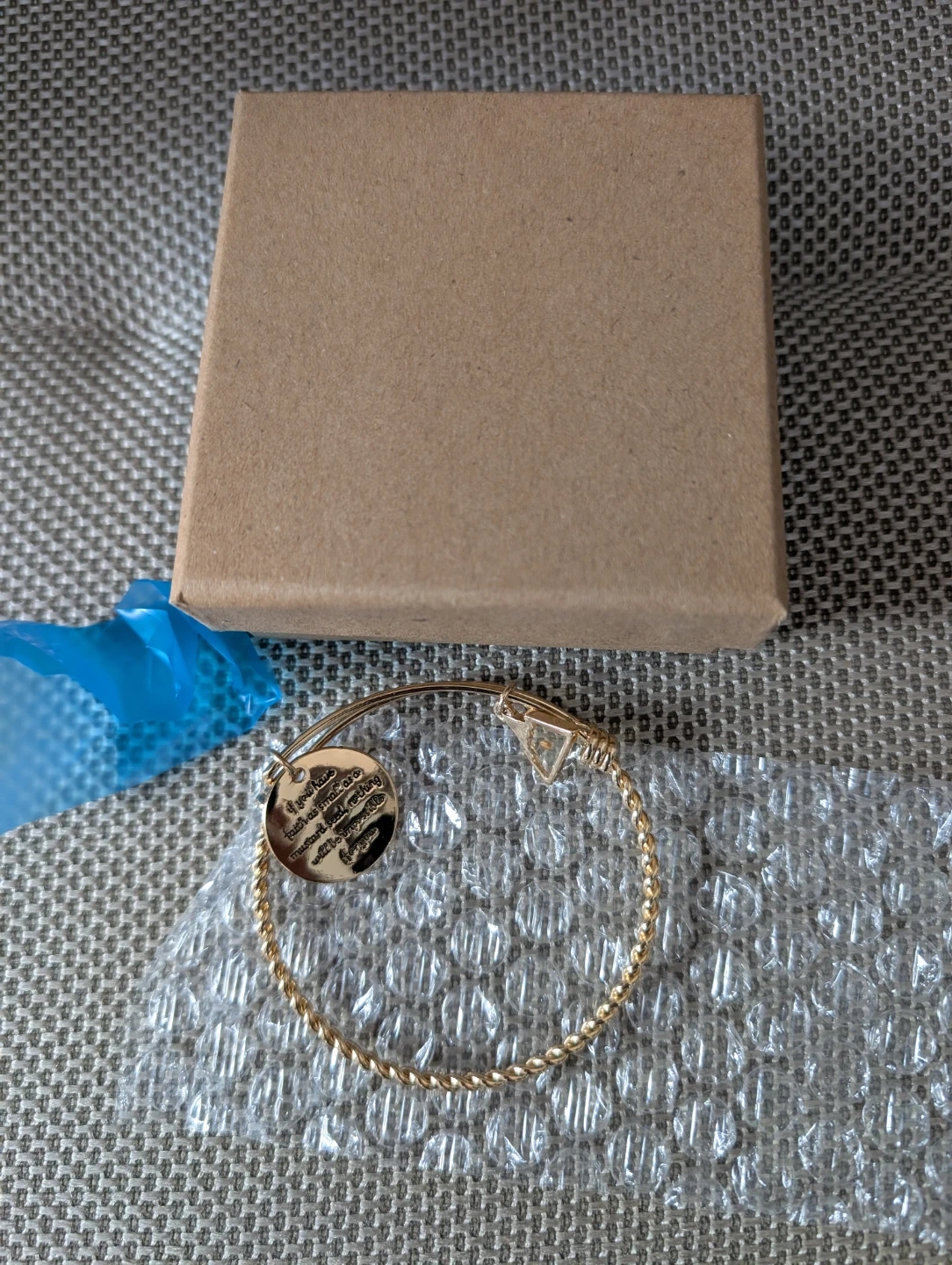 This gold tone bangle bracelet features a twisted band design. It comes with a circular charm inscribed with an inspirational message. The bracelet includes its original cardboard box for safekeeping. It's a lovely accessory for everyday wear!