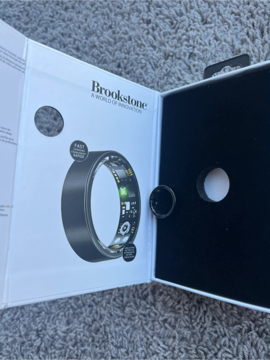 This Brookstone smart ring tracker monitors your activity and health. It tracks steps, sleep, heart rate, and blood oxygen levels. The ring comes in size 7.