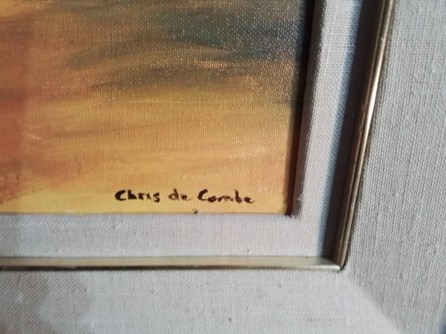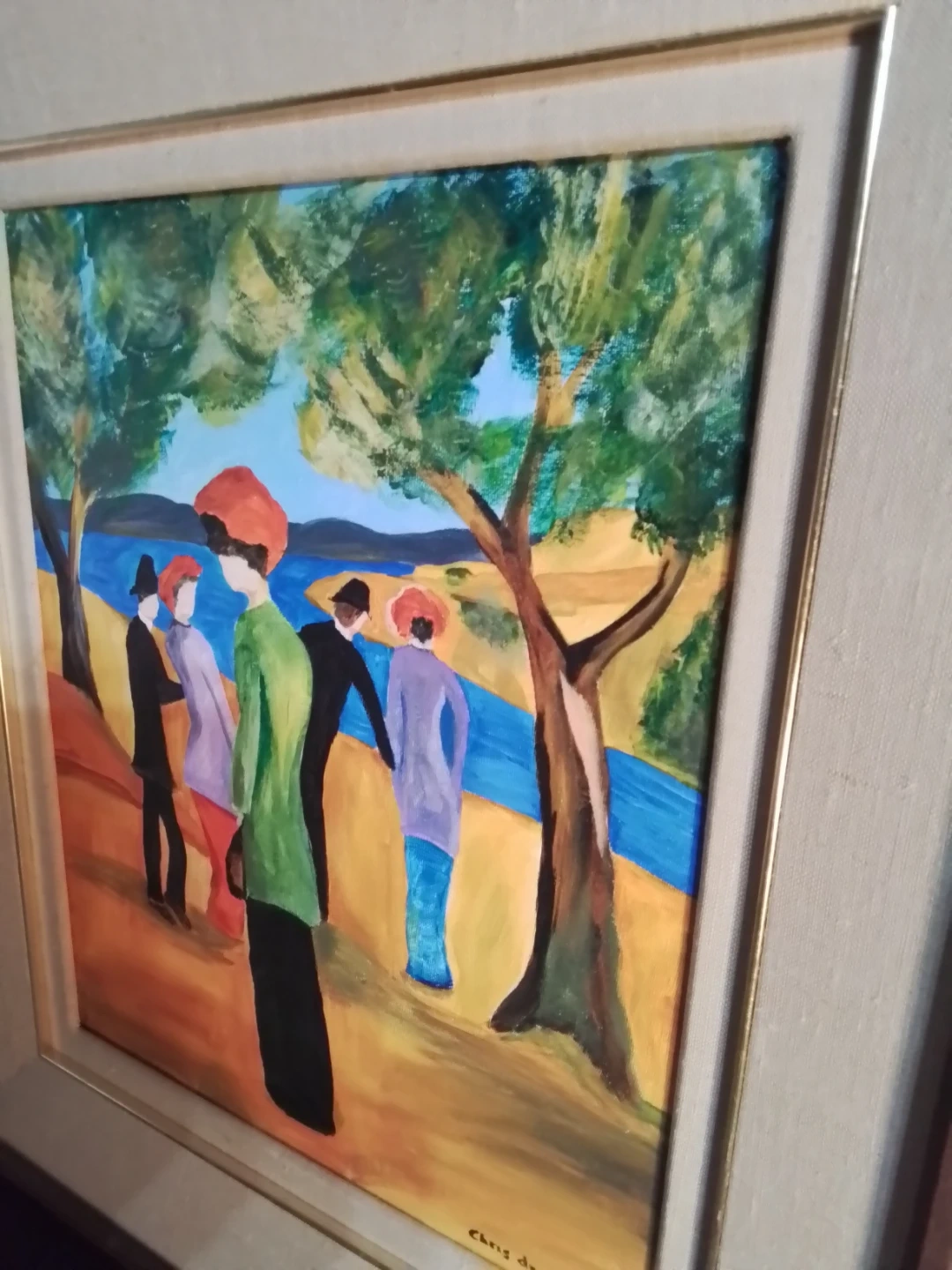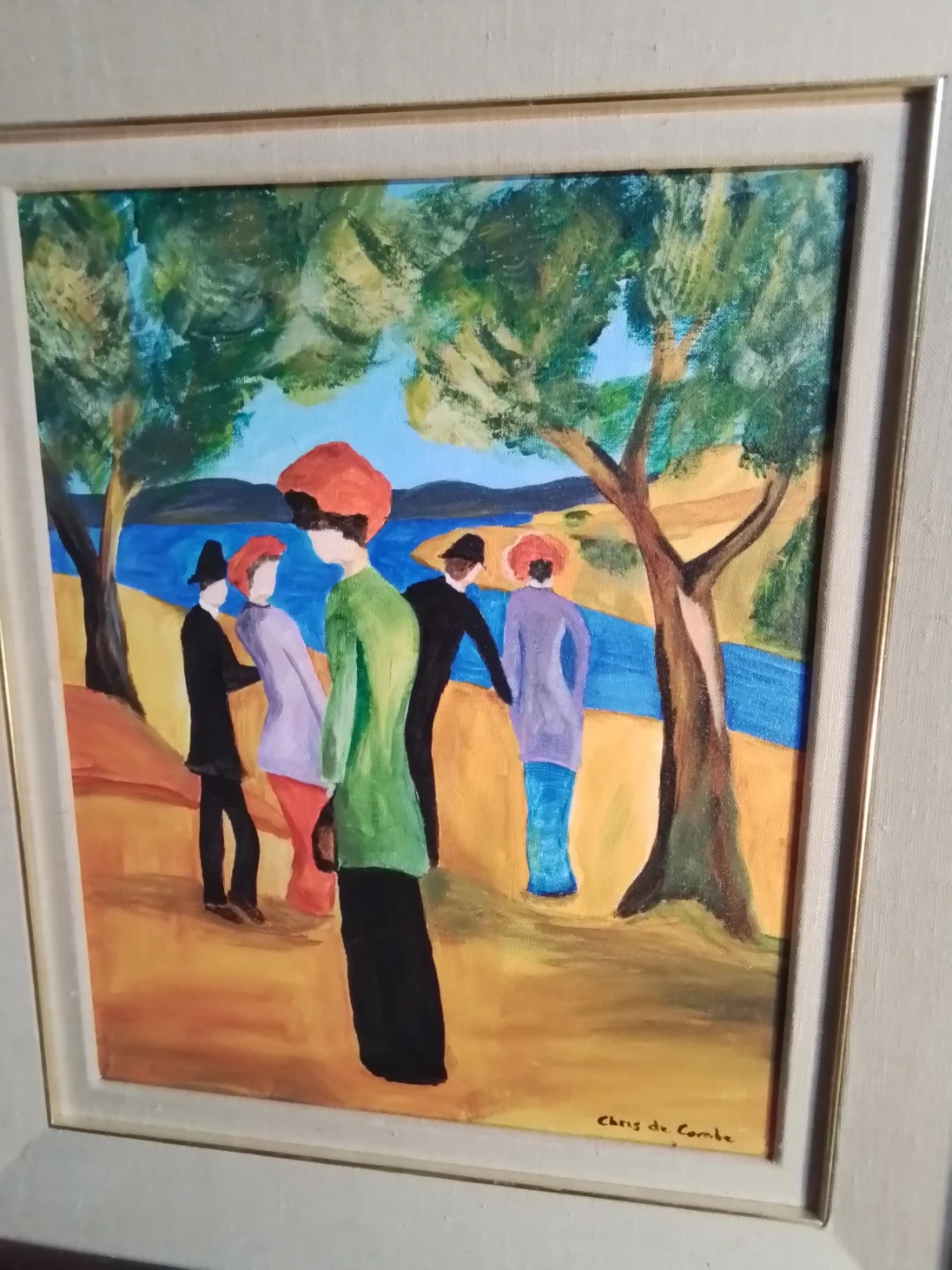 This is a framed painting on canvas by Niagara on the Lake Artist Chris De Combe. The piece features figures in a landscape and is signed by the artist. The condition is good, adding a touch of artistic elegance to any space.