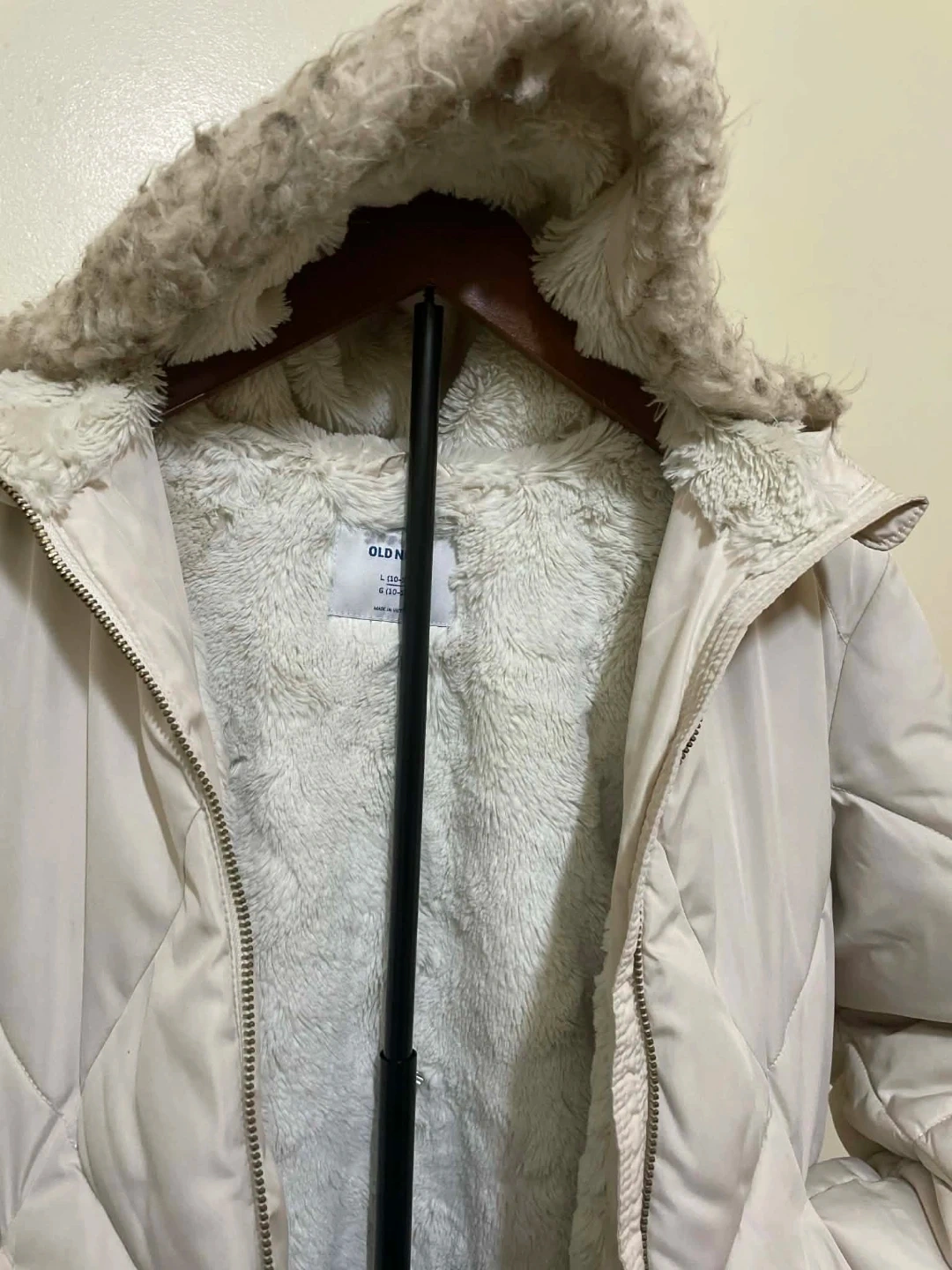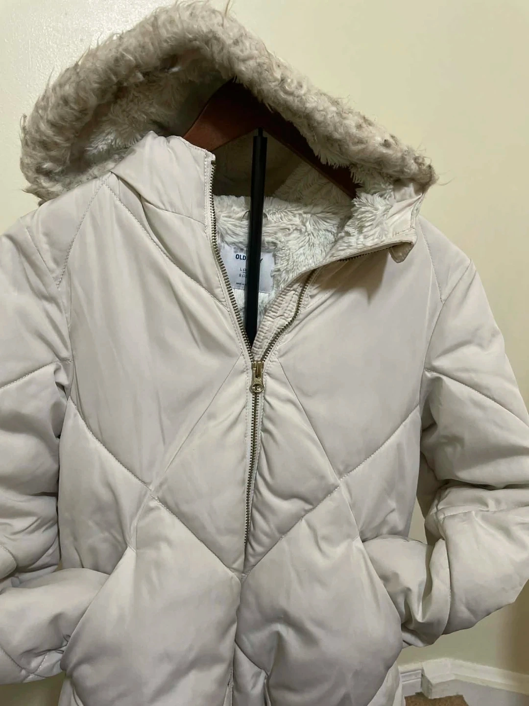 This Old Navy puffer coat is super warm and cozy, with a fluffy Sherpa lining and faux fur trim on the hood. It's a beautiful light beige colour and perfect for chilly weather! The size is L, which corresponds to 10-12 years old.