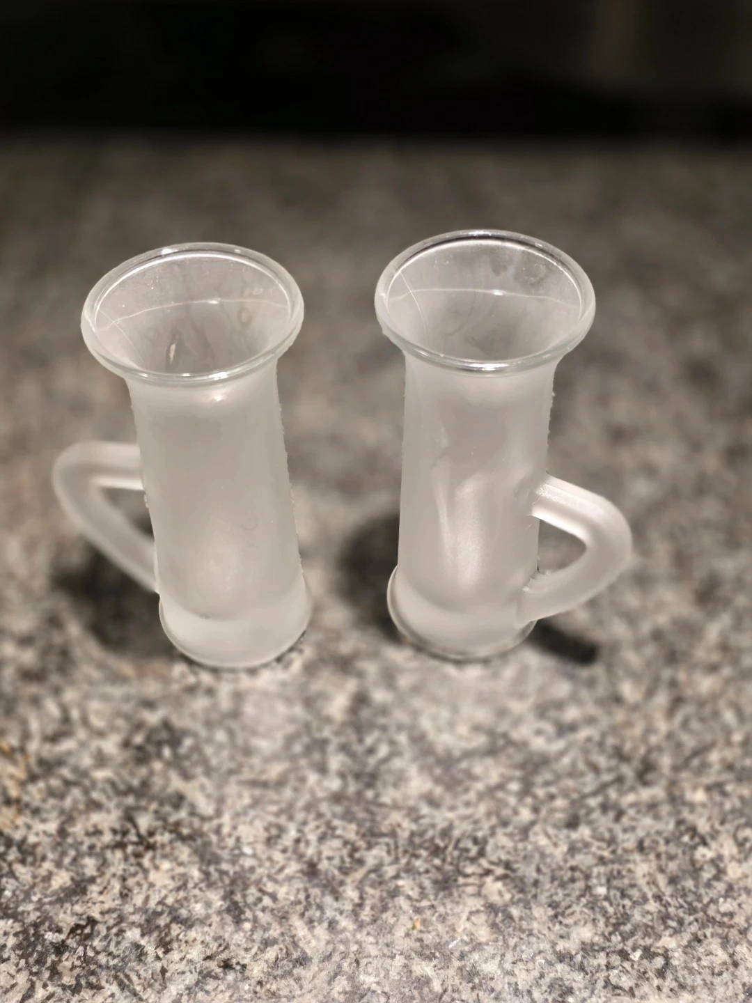 These are vintage Keglevich vodka frosted shot glasses, designed as mini mugs or shooters with flared tops and handles.