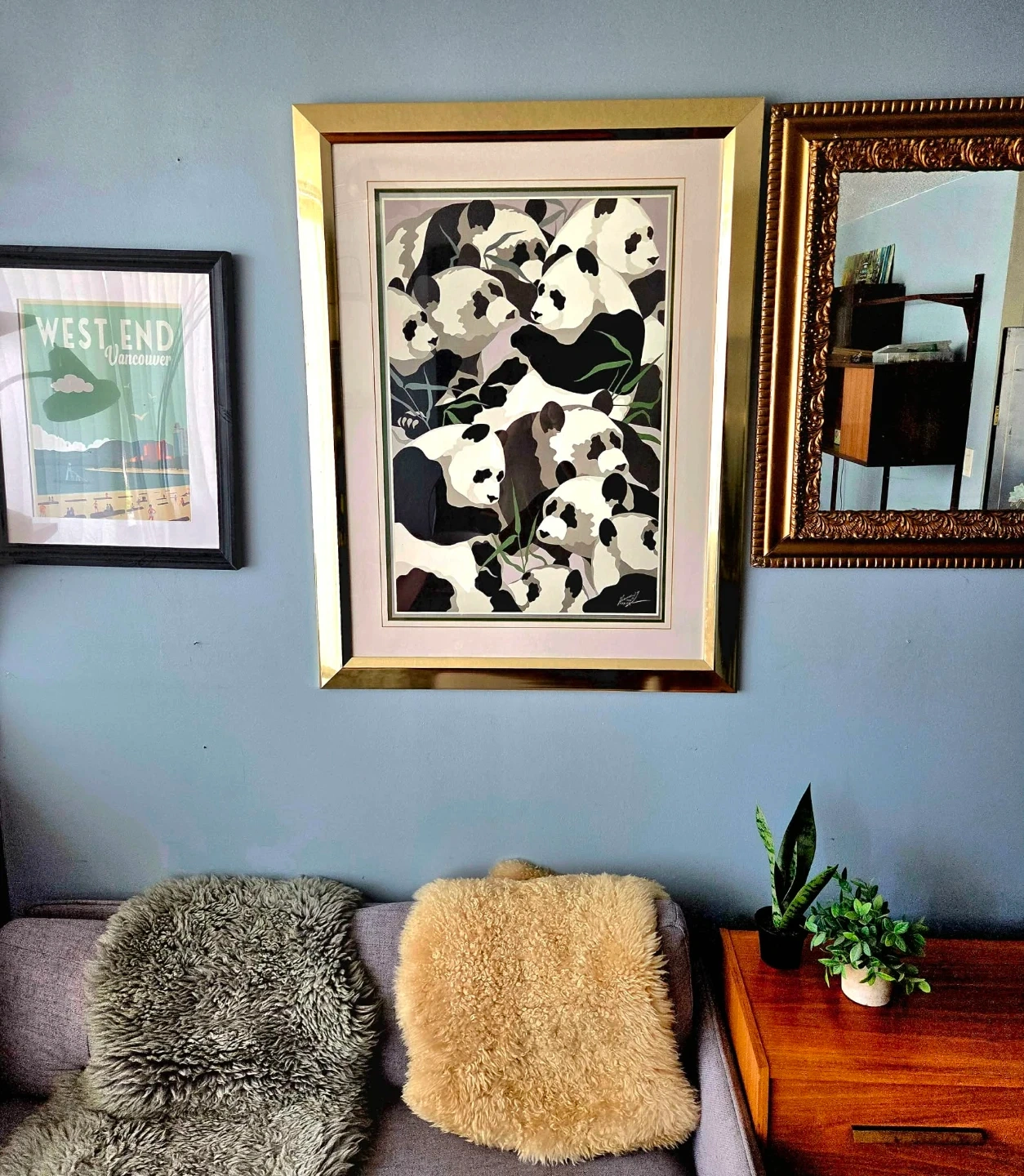 Large retro gold framed collage print of pandas by Tomas Taylor.