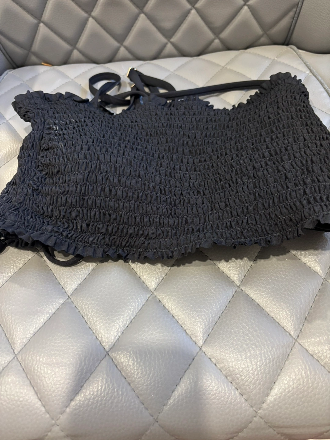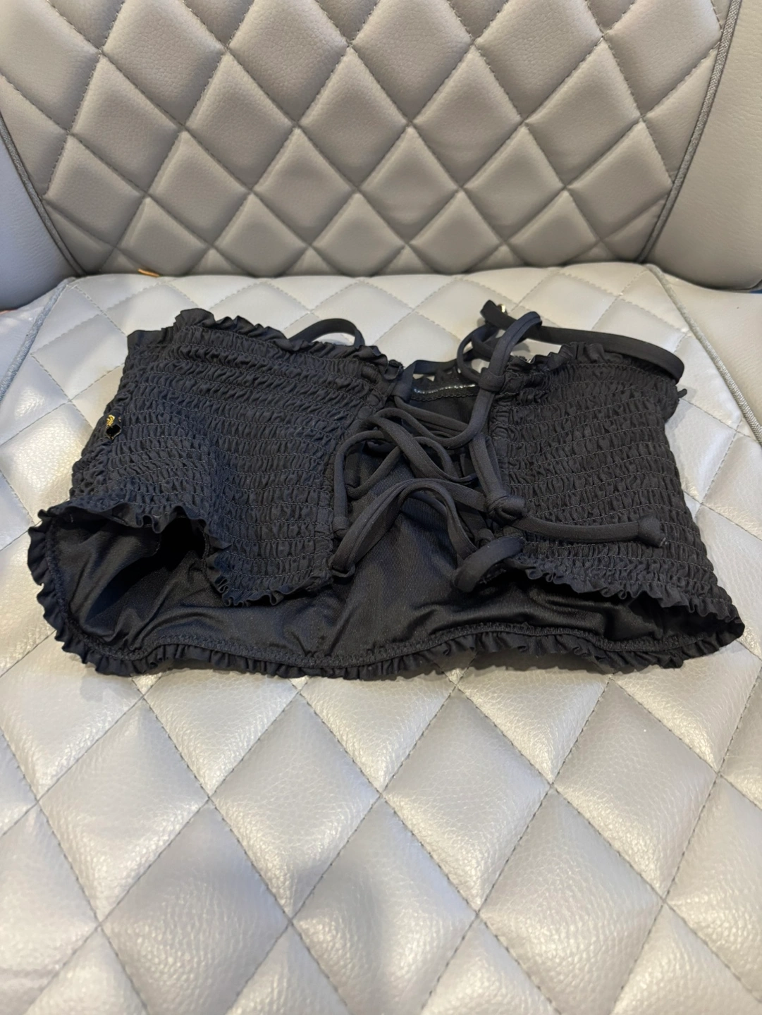 Black bikini top with adjustable straps and a lace-up detail at the front. The top is a size L/G and is made from a stretchy fabric.