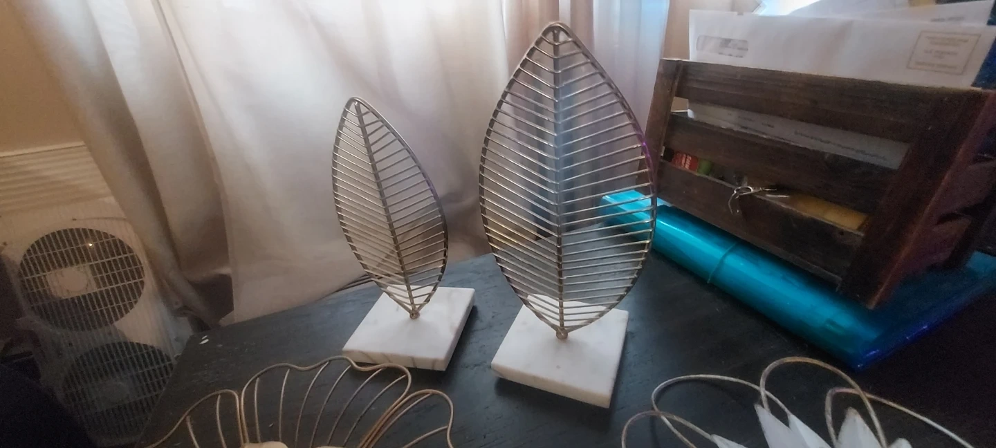 This set includes four decorative metal flower wall art pieces in various colors and two leaf sculptures with marble bases. They're crafted from metal for durability. These decorative items add a touch of elegance to any room!