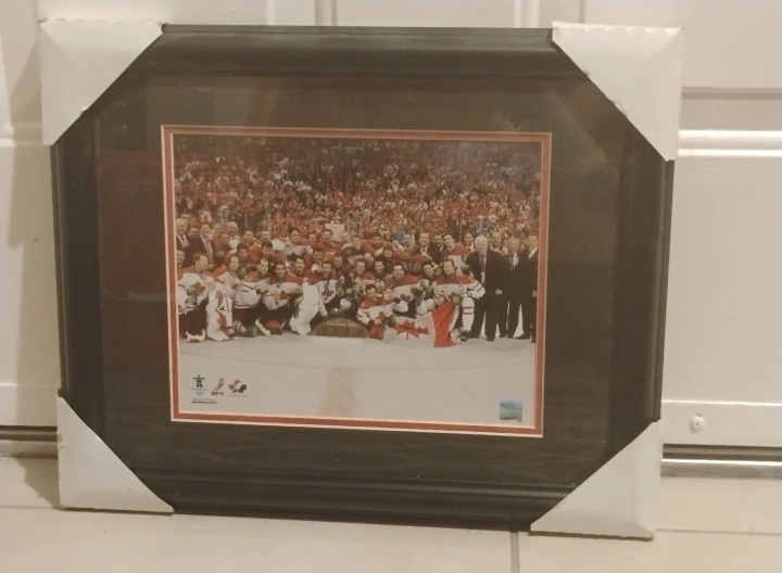 Selling a Framed Vancouver 2010 Winter Olympics Team Canada Men’s Gold Medal Winning Team Photo. It is already framed and it outer dimensions measure approximately 16 inches wide by 13 inches tall.