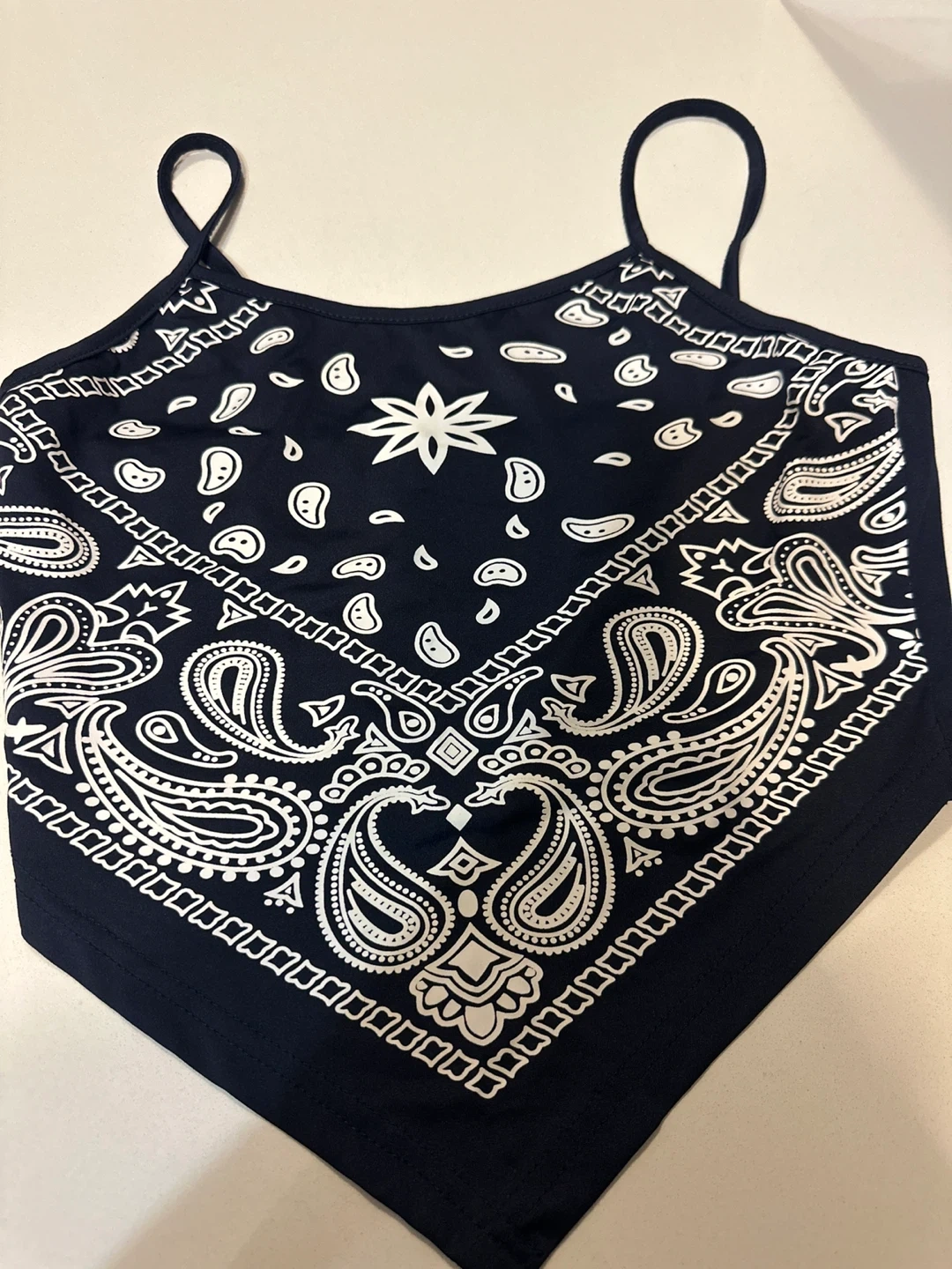 Navy blue bandana style crop top with white paisley print. Features adjustable spaghetti straps. It's made of a lightweight material. This top's perfect for warmer weather!