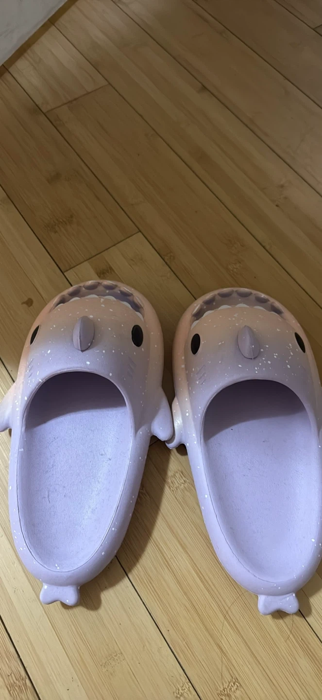 Cute whale-shaped slip-on slippers. These are made from a soft, durable rubber material and have a speckled purple design. They're comfy and fun for around the house!