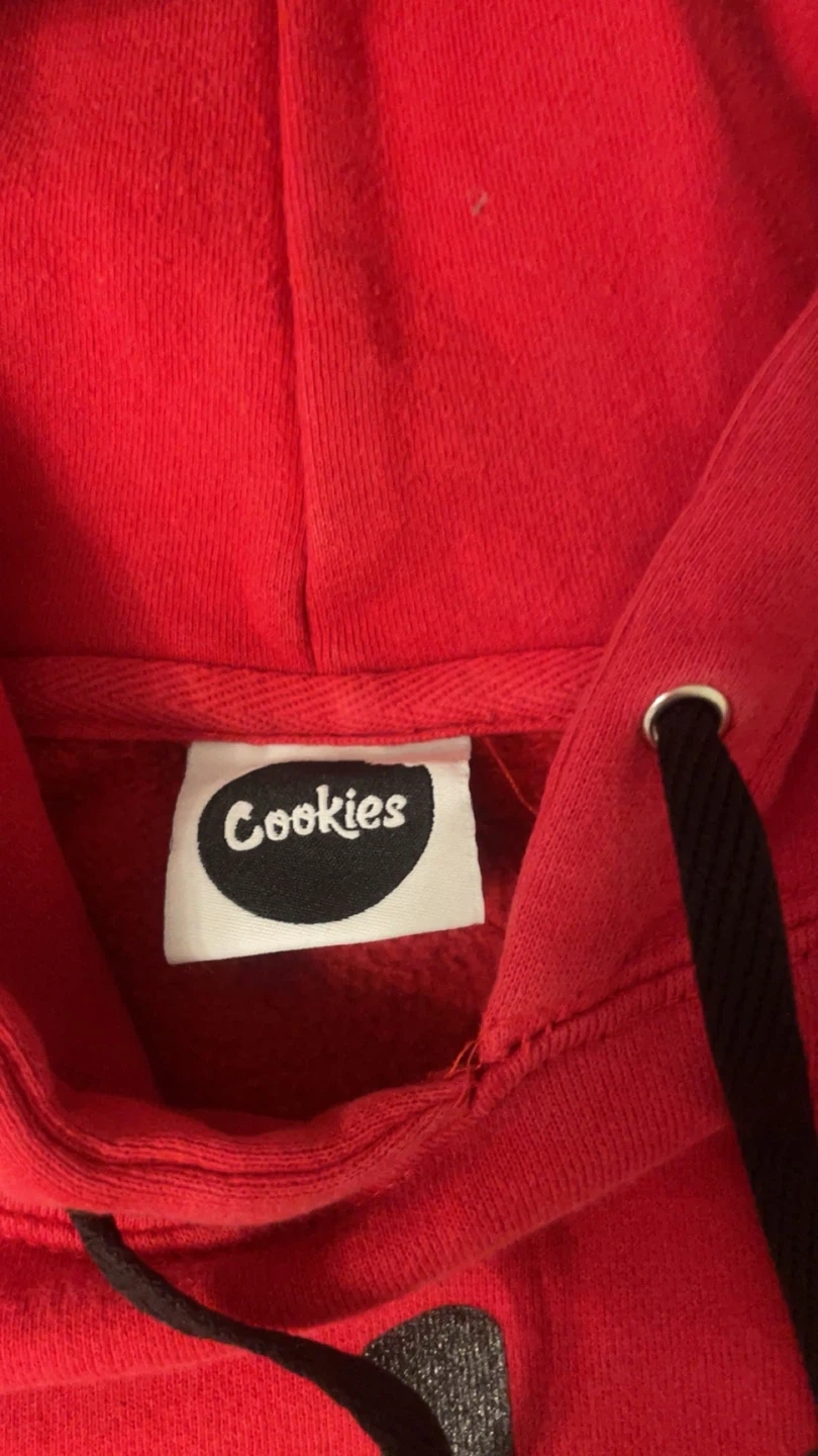 This is a red Cookies hoodie with black lettering. It's a pullover style with a front pocket and hood. Made with comfortable fabric.