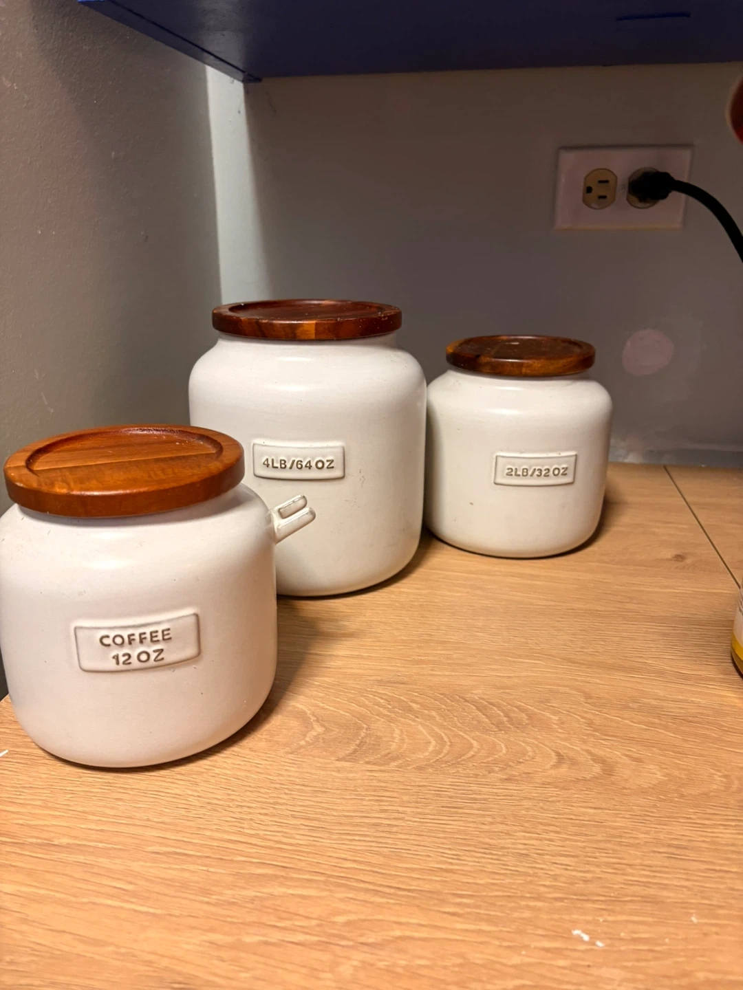 This set includes three white ceramic canisters with wooden lids, perfect for kitchen storage. The largest canister is 4lb/64oz, the medium is 2lb/32oz, and the smallest is labeled 'Coffee' at 12oz. They feature a clean design and are great for keeping dry goods fresh. The wood lids provide a nice contrast to the white ceramic.