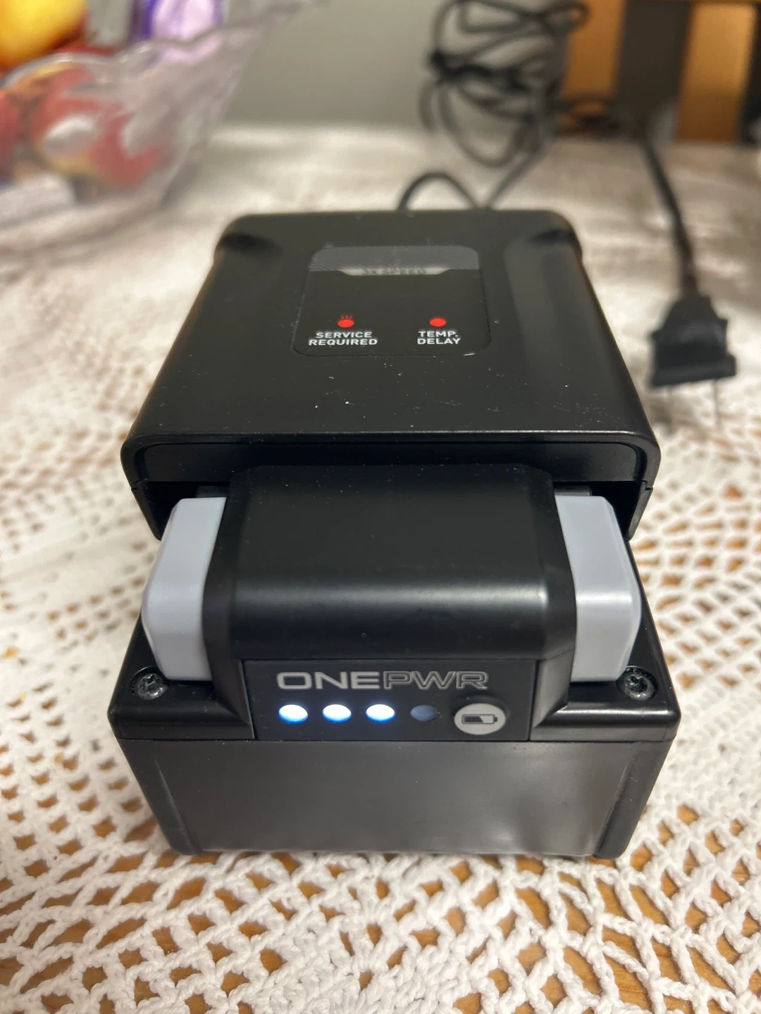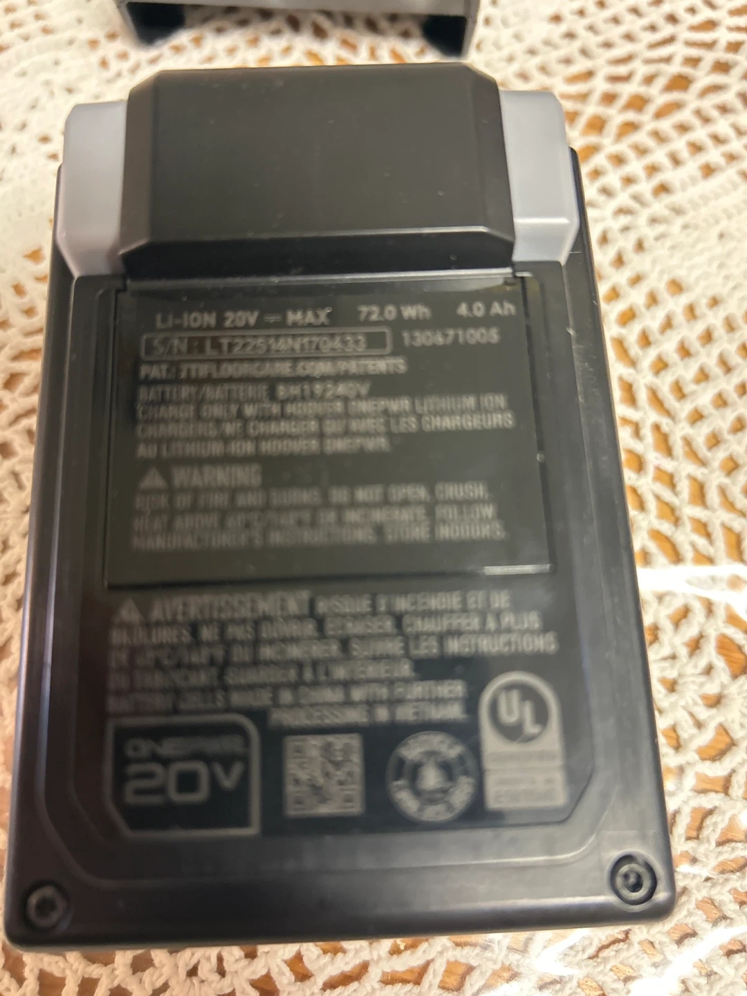 This is a Hoover ONEPWR 20V Lithium-Ion battery. It's a 4.0 Ah capacity battery, providing 72.0 Wh of power. The charger and battery pack are included.