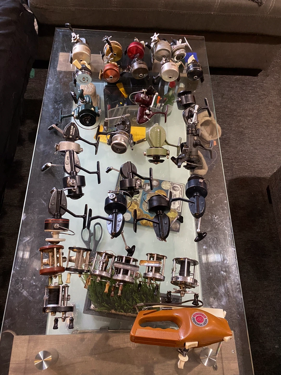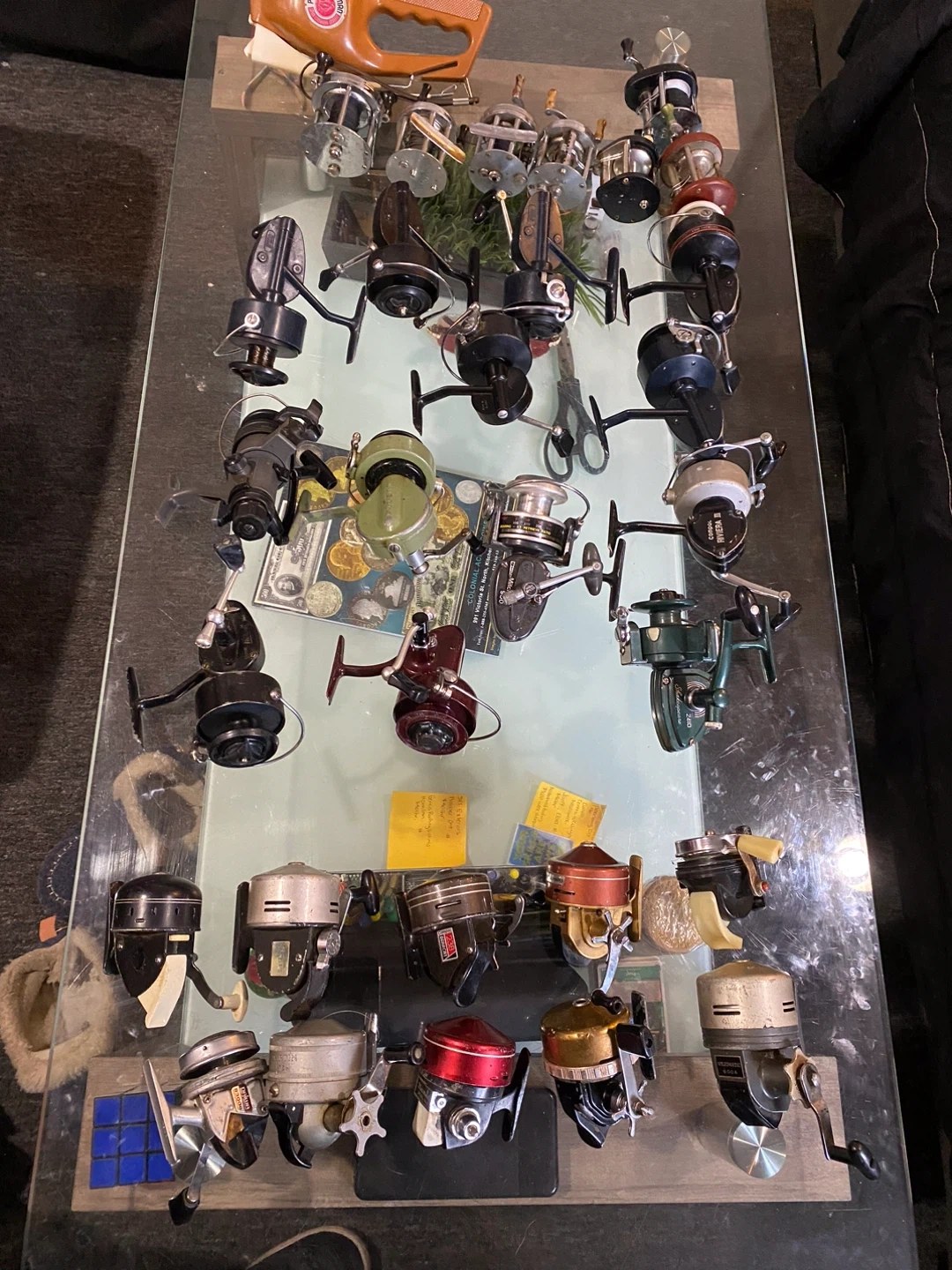 A collection of various fishing reels and rods. Reel brands include Penn, Daiwa, and Shimano. Various reel models and rod types are available. Great for anglers looking to expand their tackle box!