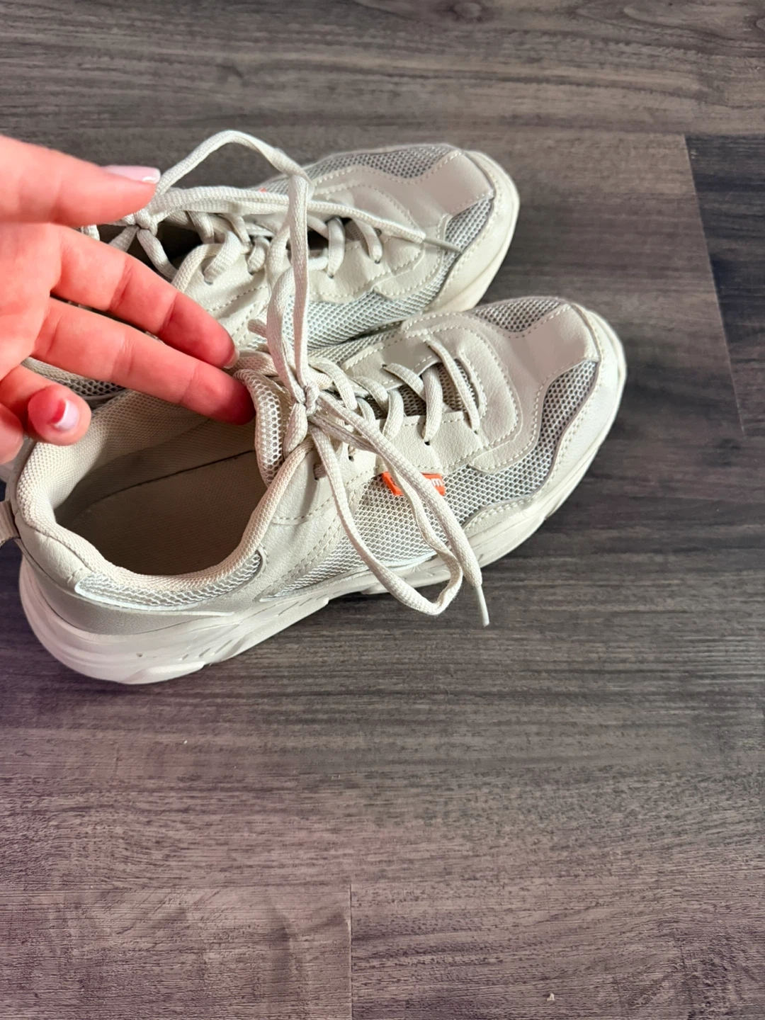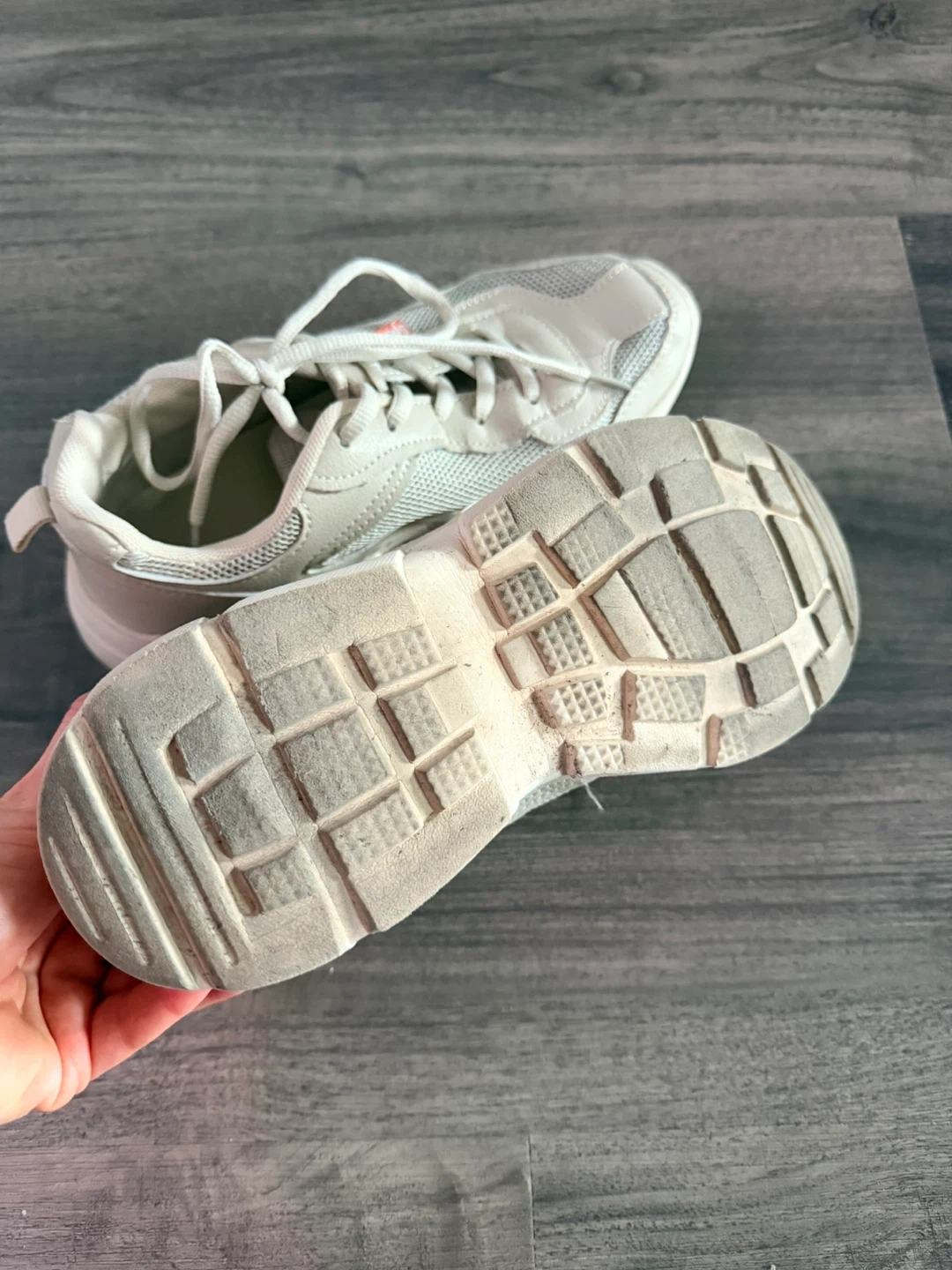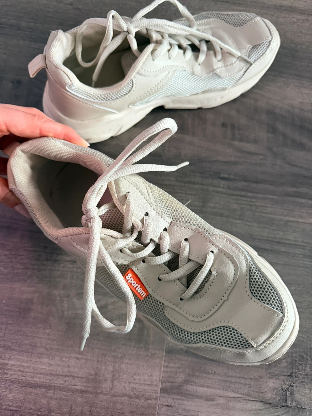 These light grey sneakers are made with a mesh and synthetic material. They feature a durable rubber sole for traction. Perfect for casual wear or light activities!