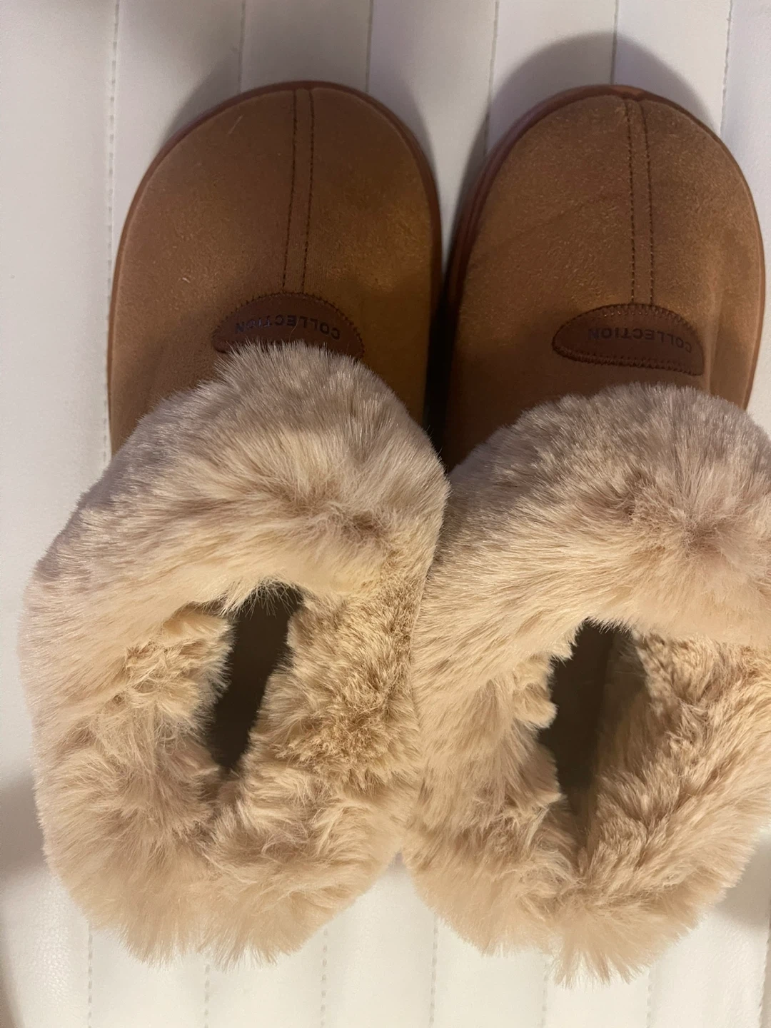 Comfy brown slippers with a soft faux fur lining. Made in China. Size 40-41 (fits approx. 270mm). These slippers are great for keeping your feet warm around the house!