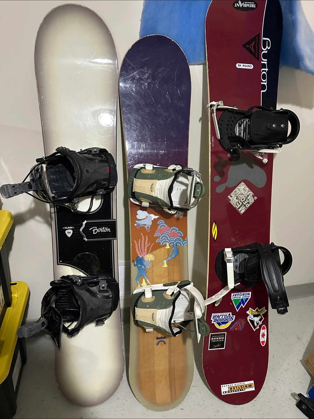 Three Burton snowboards are ready for the slopes. One features the Burton Clash model. Bindings are included on all three.