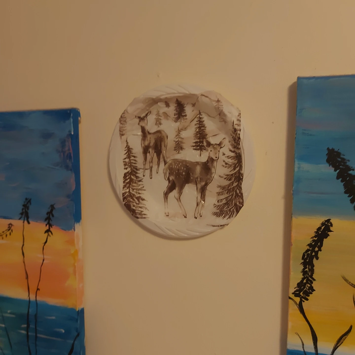 A decorative plate featuring a charming winter scene with deer and pine trees. It has a unique watercolor-style print. This plate is great for adding a rustic touch to your home decor! You can also hang it up too. Or you can serve a light snack over it on a clear plate.